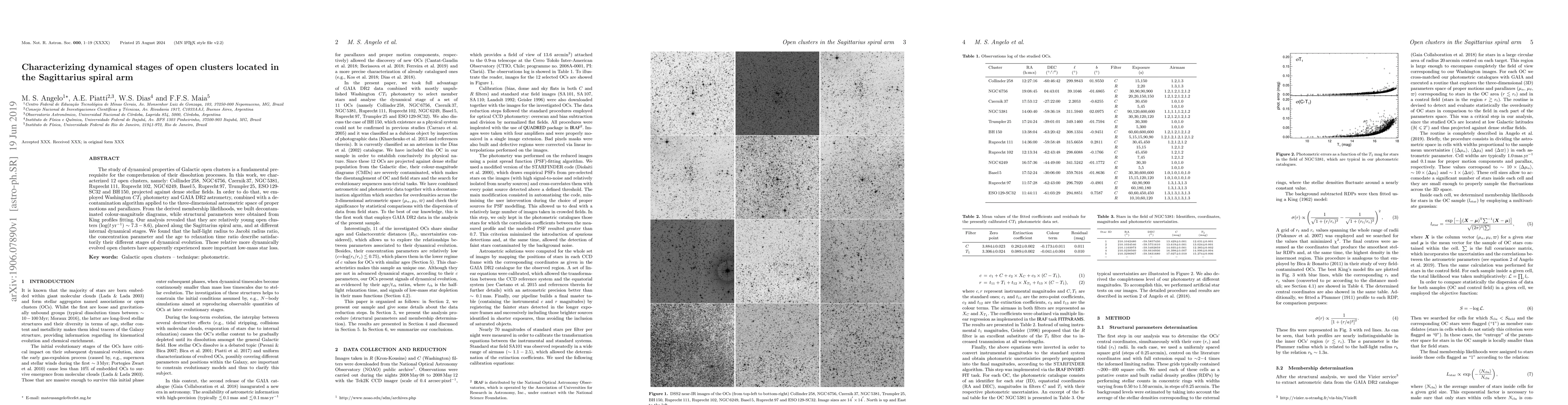 The study of dynamical properties of Galactic open clusters is a fundamental prerequisite for the comprehension of their dissolution processes. In this work, we characterized 12 open clusters, namely: Collinder 258, NGC 6756, Czernik 37, NGC 5381, Ruprecht 111, Ruprecht 102, NGC 6249, Basel 5, Ruprecht 97, Trumpler 25, ESO 129-SC32 and BH 150, projected against dense stellar fields. In order to do that, we employed Washington $CT_{1}$ photometry and GAIA DR2 astrometry, combined with a decontamination algorithm applied to the three-dimensional astrometric space of proper motions and parallaxes. From the derived membership likelihoods, we built decontaminated colour-magnitude diagrams, while structural parameters were obtained from King profiles fitting. Our analysis revealed that they are relatively young open clusters (log($t$ yr$^{-1}$) $\sim7.3-8.6$), placed along the Sagittarius spiral arm, and at different internal dynamical stages. We found that the half-light radius to Jacobi radius ratio, the concentration parameter and the age to relaxation time ratio describe satisfactorily their different stages of dynamical evolution. Those relative more dynamically evolved open clusters have apparently experienced more important low-mass star loss.