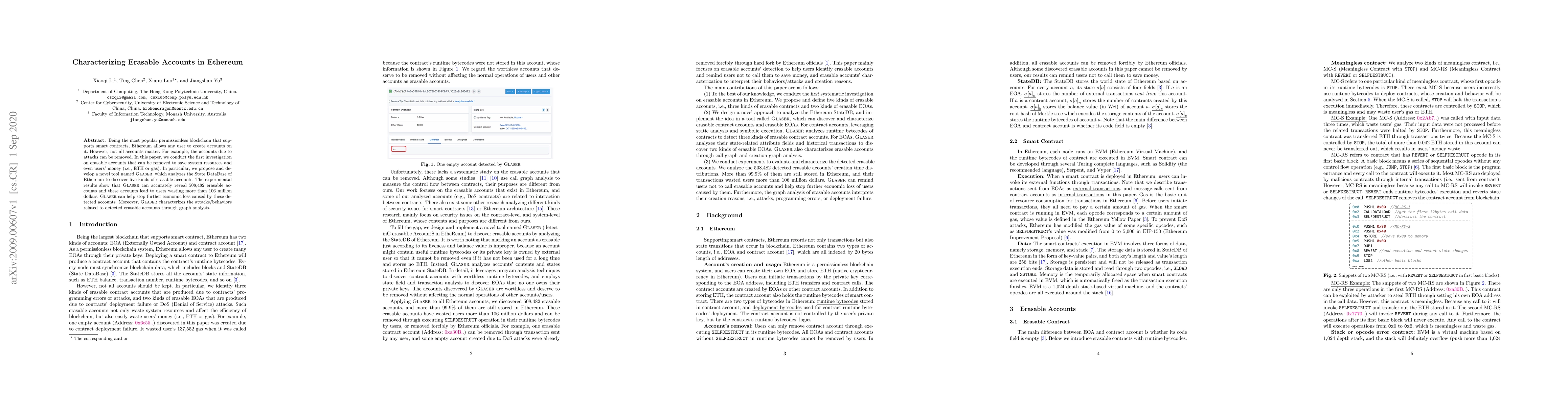 This work is novel as it is the first to systematically characterize erasable accounts in Ethereum, providing a comprehensive analysis and a practical tool (GLASER) for detection and prevention.