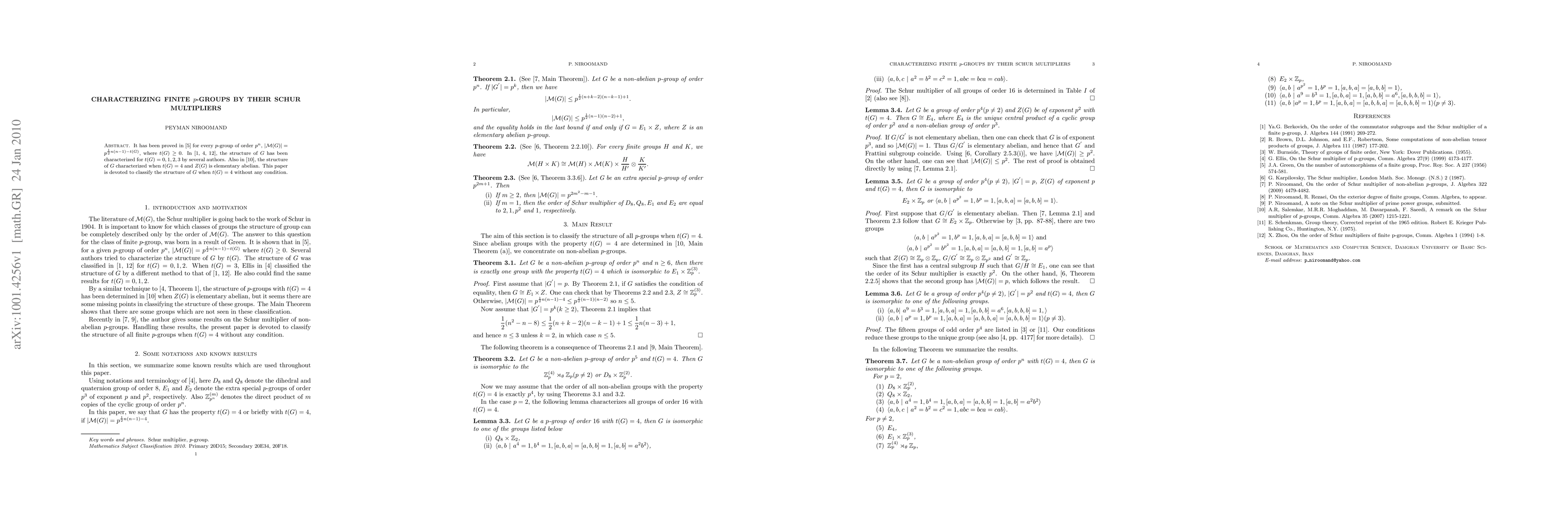It has been proved in \cite{ge} for every $p$-group of order $p^n$, $|\mathcal{M}(G)|=p^{\f{1}{2}n(n-1)-t(G)}$, where $t(G)\geq 0$. In \cite{be, el, zh}, the structure of $G$ has been characterized for $t(G)=0,1,2,3$ by several authors. Also in \cite{sa}, the structure of $G$ characterized when $t(G)=4$ and $Z(G)$ is elementary abelian. This paper is devoted to classify the structure of $G$ when $t(G)=4$ without any condition.