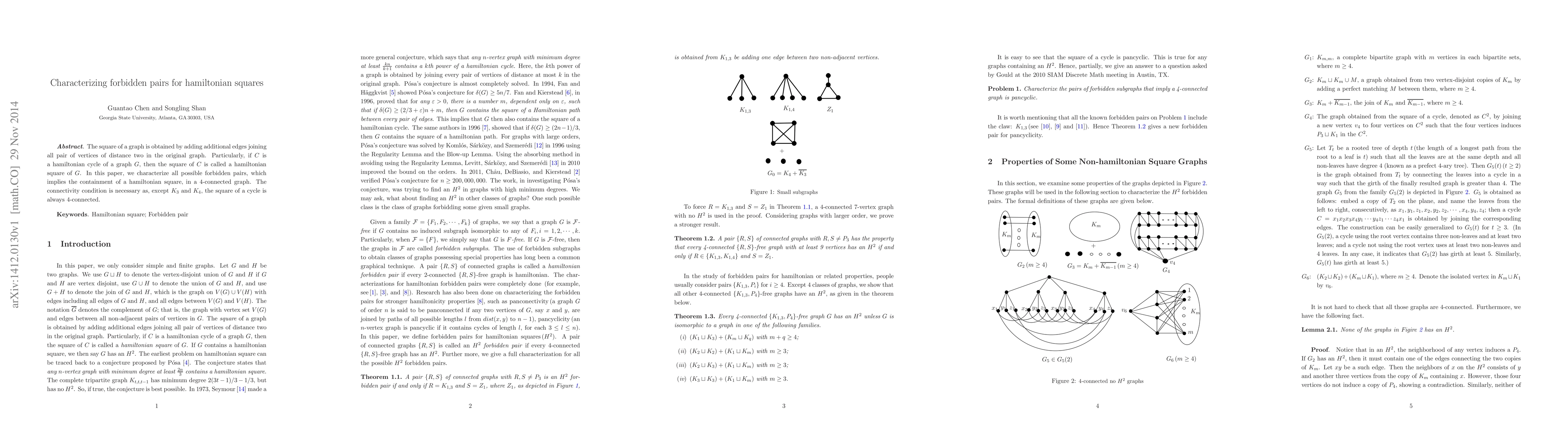This paper characterizes forbidden pairs in 4-connected graphs that prevent the existence of a hamiltonian square, which is the square of a hamiltonian cycle in the original graph. The study highlights the necessity of the 4-connectedness condition for the problem.