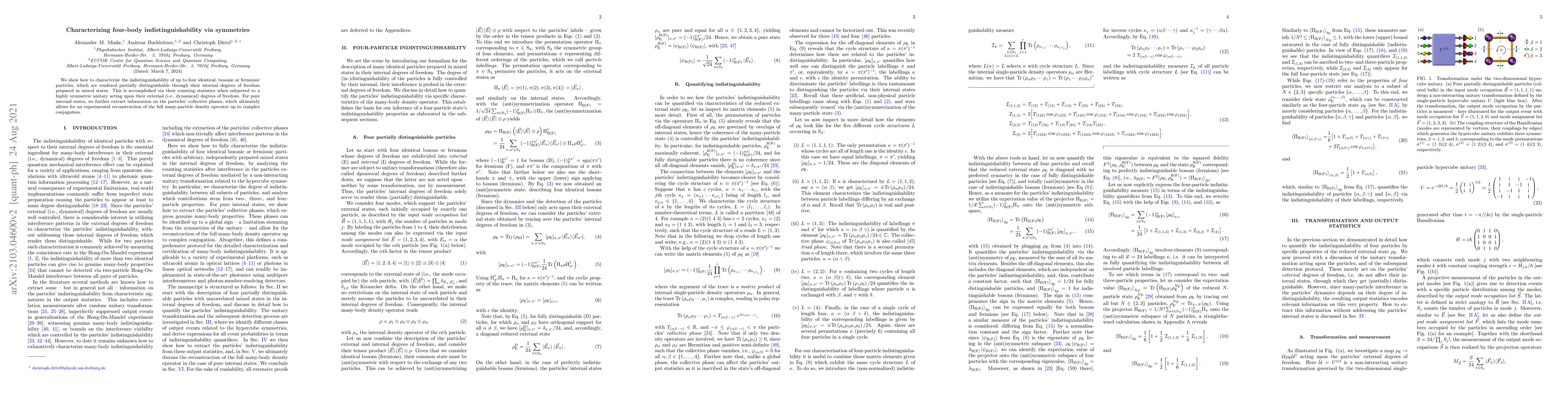 Researchers developed a method to characterize the indistinguishability of up to four identical particles using their counting statistics under symmetries, allowing for the reconstruction of the full many-particle density operator.