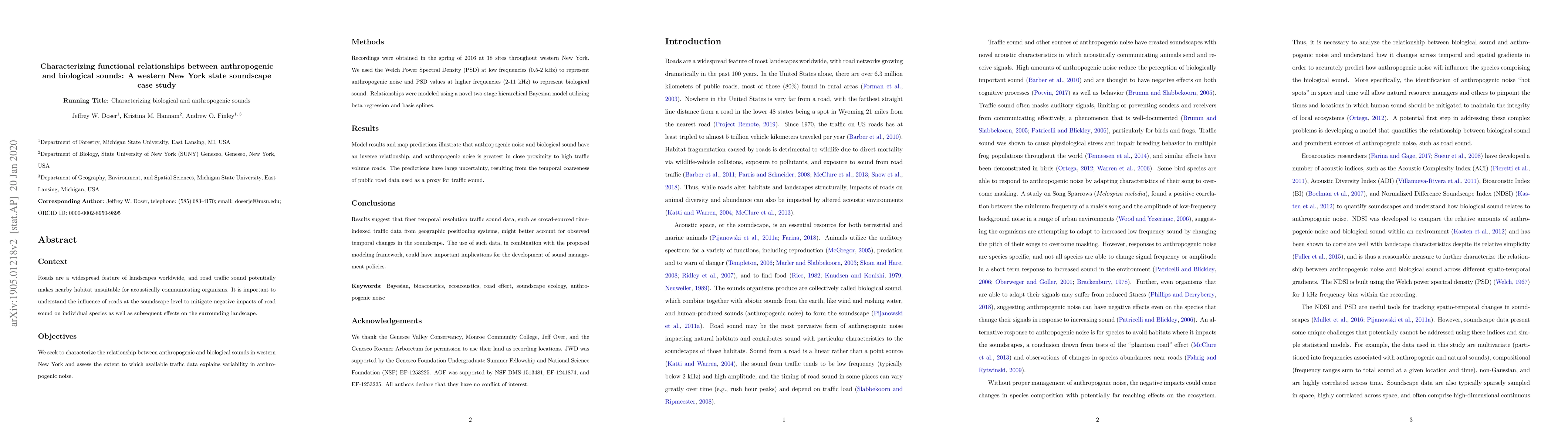 Roads are a widespread feature of landscapes worldwide, and road traffic sound potentially makes nearby habitat unsuitable for acoustically communicating organisms. It is important to understand the influence of roads at the soundscape level to mitigate negative impacts of road sound on individual species as well as subsequent effects on the surrounding landscape. We seek to characterize the relationship between anthropogenic and biological sounds in western New York and assess the extent to which available traffic data explains variability in anthropogenic noise. Recordings were obtained in the spring of 2016 at 18 sites throughout western New York. We used the Welch Power Spectral Density (PSD) at low frequencies (0.5-2 kHz) to represent anthropogenic noise and PSD values at higher frequencies (2-11 kHz) to represent biological sound. Relationships were modeled using a novel two-stage hierarchical Bayesian model utilizing beta regression and basis splines. Model results and map predictions illustrate that anthropogenic noise and biological sound have an inverse relationship, and anthropogenic noise is greatest in close proximity to high traffic volume roads. The predictions have large uncertainty, resulting from the temporal coarseness of public road data used as a proxy for traffic sound. Results suggest that finer temporal resolution traffic sound data, such as crowd-sourced time-indexed traffic data from geographic positioning systems, might better account for observed temporal changes in the soundscape. The use of such data, in combination with the proposed modeling framework, could have important implications for the development of sound management policies.