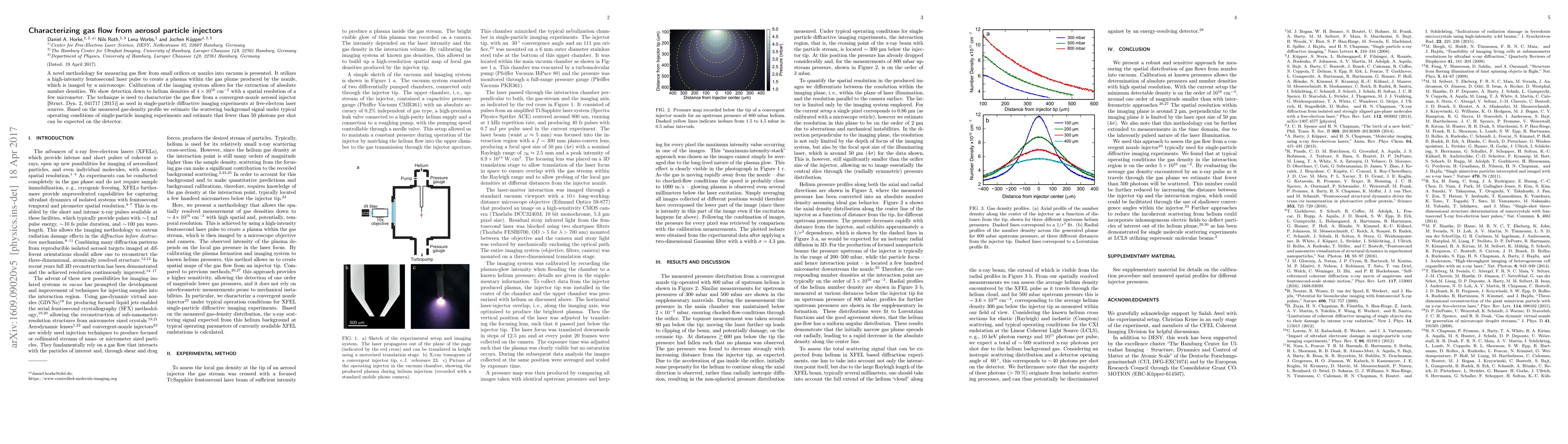 A novel methodology for measuring gas flow from small orifices or nozzles into vacuum is presented. It utilizes a high-intensity femtosecond laser pulse to create a plasma within the gas plume produced by the nozzle, which is imaged by a microscope. Calibration of the imaging system allows for the extraction of absolute number densities. We show detection down to helium densities of $4\times10^{16}$~cm$^{-3}$ with a spatial resolution of a few micrometer. The technique is used to characterize the gas flow from a convergent-nozzle aerosol injector [Struct.\ Dyn.~2, 041717 (2015)] as used in single-particle diffractive imaging experiments at free-electron laser sources. Based on the measured gas-density profile we estimate the scattering background signal under typical operating conditions of single-particle imaging experiments and estimate that fewer than 50 photons per shot can be expected on the detector.