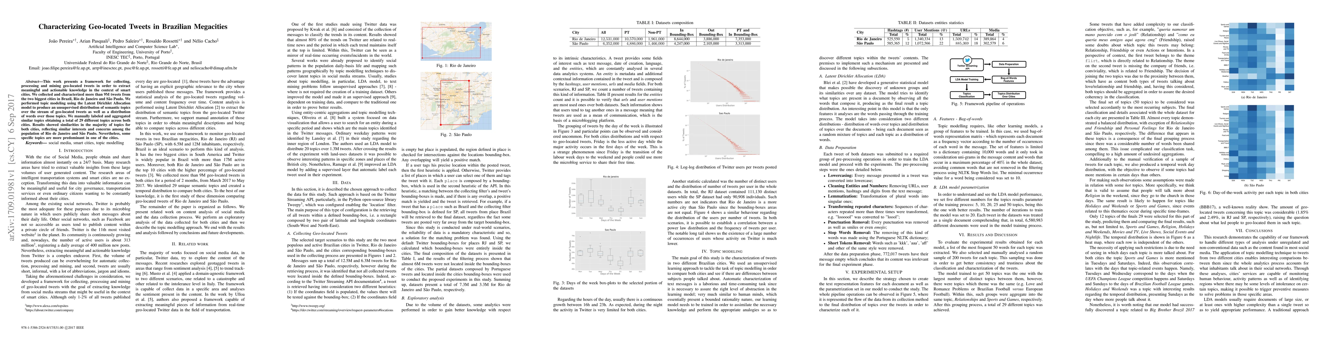This study develops a framework for analyzing over 9M geo-located tweets from Rio de Janeiro and São Paulo, identifying 29 topics through topic modeling and manual labeling. The analysis reveals similarities in interests between the cities, though some topics are more prominent in one city over the other.