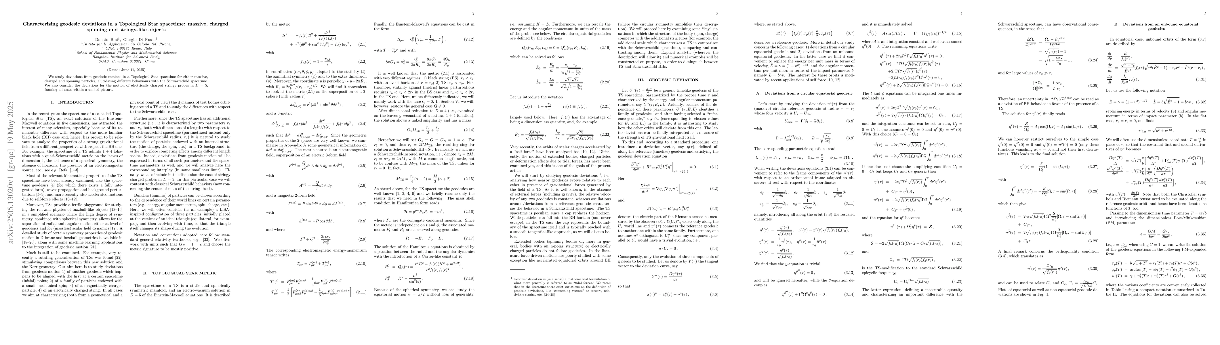 The paper presents a comprehensive analysis of geodesic deviations for various particle types in a Topological Star spacetime, extending previous work to include charged and spinning particles and stringy probes.