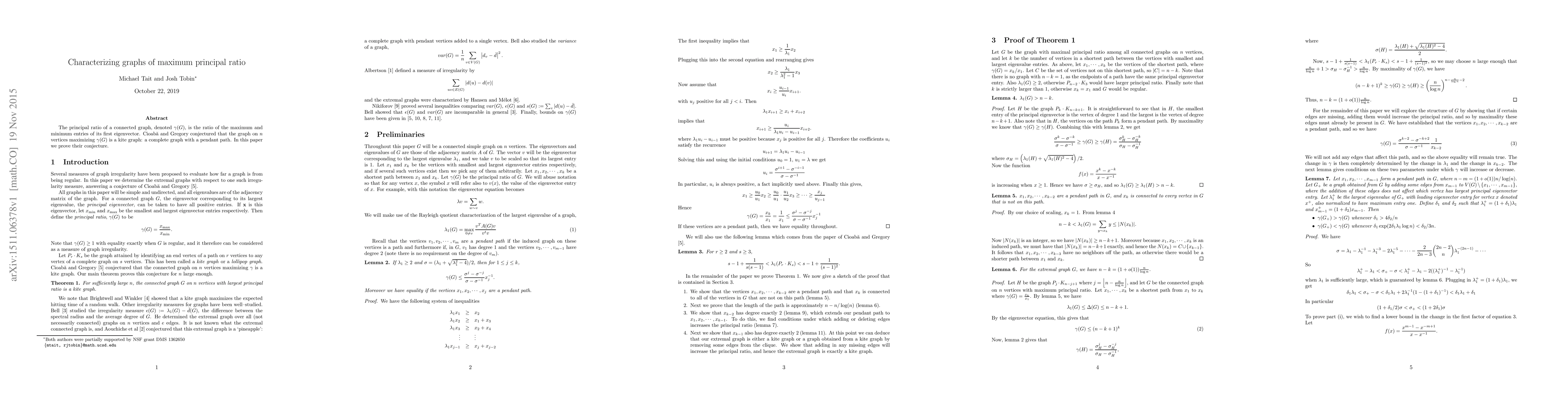 This paper proves Cioab and Gregory's conjecture that a kite graph maximizes the principal ratio of its eigenvectors, proving it is the graph with maximum principal ratio.