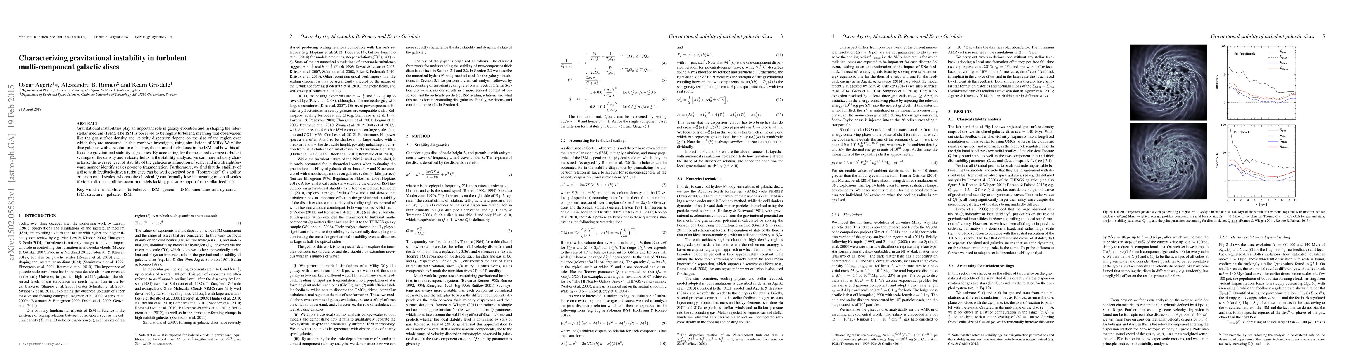 This paper investigates how turbulence in the interstellar medium (ISM) affects the gravitational stability of Milky Way-like galactic discs using high-resolution simulations. It finds that a "Toomre-like" $Q$ criterion effectively describes stability across scales, while classical $Q$ is less reliable in the absence of stellar feedback.