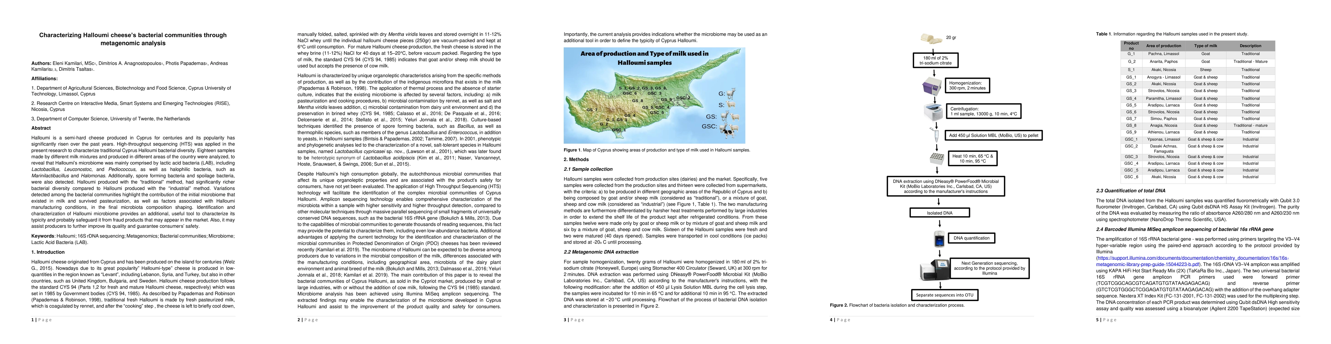 Halloumi is a semi hard cheese produced in Cyprus for centuries and its popularity has significantly risen over the past years. High throughput sequencing (HTS) was applied in the present research to characterize traditional Cyprus Halloumi bacterial diversity. Eighteen samples made by different milk mixtures and produced in different areas of the country were analyzed, to reveal that Halloumi microbiome was mainly comprised by lactic acid bacteria (LAB), including Lactobacillus, Leuconostoc, and Pediococcus, as well as halophilic bacteria, such as Marinilactibacillus and Halomonas. Additionally, spore forming bacteria and spoilage bacteria, were also detected. Halloumi produced with the traditional method, had significantly richer bacterial diversity compared to Halloumi produced with the industrial method. Variations detected among the bacterial communities highlight the contribution of the initial microbiome that existed in milk and survived pasteurization, as well as factors associated with Halloumi manufacturing conditions, in the final microbiota composition shaping. Identification and characterization of Halloumi microbiome provides an additional, useful tool to characterize its typicity and probably safeguard it from fraud products that may appear in the market. Also, it may assist producers to further improve its quality and guarantee consumers safety.