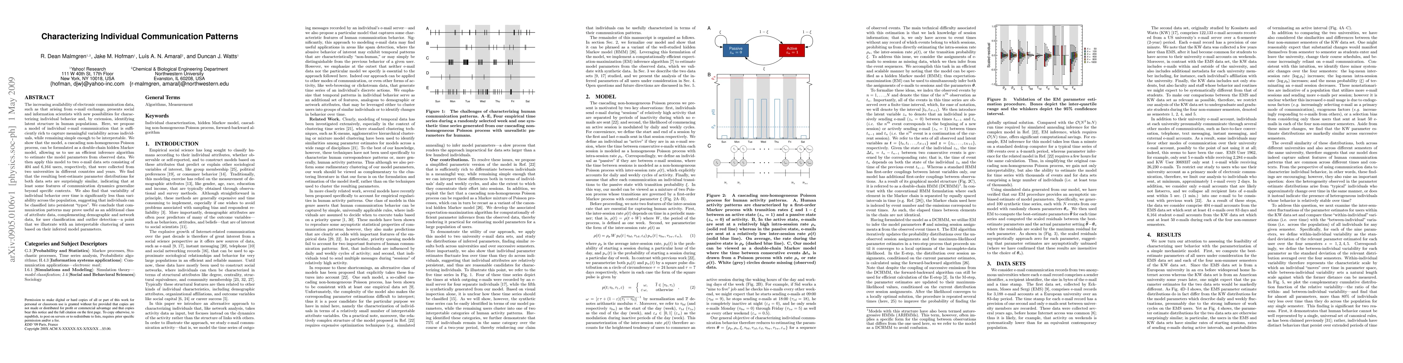 The increasing availability of electronic communication data, such as that arising from e-mail exchange, presents social and information scientists with new possibilities for characterizing individual behavior and, by extension, identifying latent structure in human populations. Here, we propose a model of individual e-mail communication that is sufficiently rich to capture meaningful variability across individuals, while remaining simple enough to be interpretable. We show that the model, a cascading non-homogeneous Poisson process, can be formulated as a double-chain hidden Markov model, allowing us to use an efficient inference algorithm to estimate the model parameters from observed data. We then apply this model to two e-mail data sets consisting of 404 and 6,164 users, respectively, that were collected from two universities in different countries and years. We find that the resulting best-estimate parameter distributions for both data sets are surprisingly similar, indicating that at least some features of communication dynamics generalize beyond specific contexts. We also find that variability of individual behavior over time is significantly less than variability across the population, suggesting that individuals can be classified into persistent "types". We conclude that communication patterns may prove useful as an additional class of attribute data, complementing demographic and network data, for user classification and outlier detection--a point that we illustrate with an interpretable clustering of users based on their inferred model parameters.