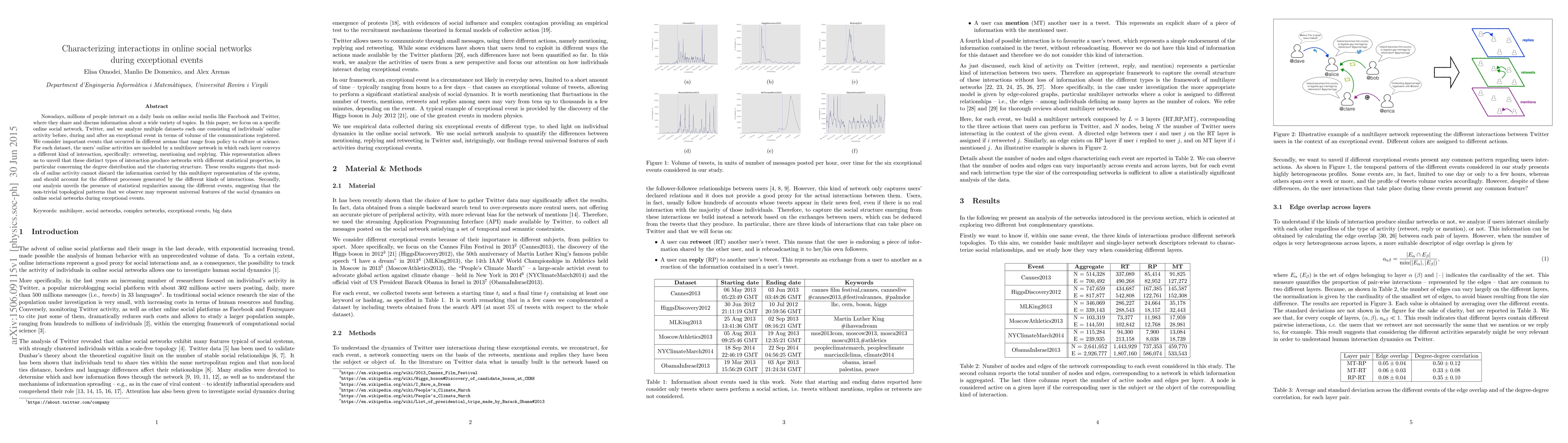 Nowadays, millions of people interact on a daily basis on online social media like Facebook and Twitter, where they share and discuss information about a wide variety of topics. In this paper, we focus on a specific online social network, Twitter, and we analyze multiple datasets each one consisting of individuals' online activity before, during and after an exceptional event in terms of volume of the communications registered. We consider important events that occurred in different arenas that range from policy to culture or science. For each dataset, the users' online activities are modeled by a multilayer network in which each layer conveys a different kind of interaction, specifically: retweeting, mentioning and replying. This representation allows us to unveil that these distinct types of interaction produce networks with different statistical properties, in particular concerning the degree distribution and the clustering structure. These results suggests that models of online activity cannot discard the information carried by this multilayer representation of the system, and should account for the different processes generated by the different kinds of interactions. Secondly, our analysis unveils the presence of statistical regularities among the different events, suggesting that the non-trivial topological patterns that we observe may represent universal features of the social dynamics on online social networks during exceptional events.