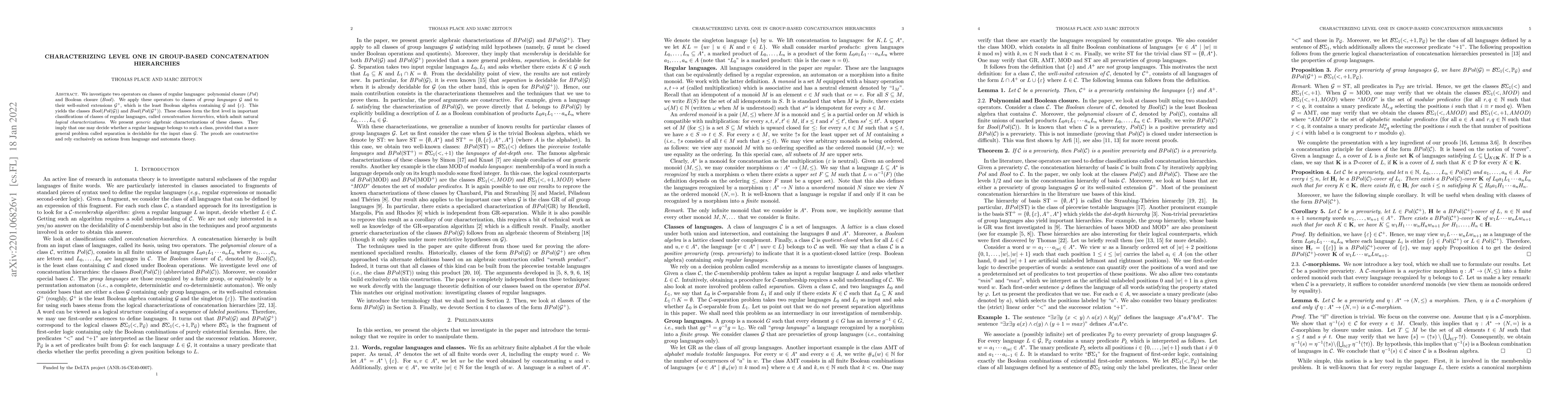 We investigate two operators on classes of regular languages: polynomial closure (Pol) and Boolean closure (Bool). We apply these operators to classes of group languages G and to their well-suited extensions G+, which is the least Boolean algebra containing G and the singleton language containing the empty word. This yields the classes Bool(Pol(G)) and Bool(Pol(G+)). These classes form the first level in important classifications of classes of regular languages, called concatenation hierarchies, which admit natural logical characterizations. We present generic algebraic characterizations of these classes. They imply that one may decide whether a regular language belongs to such a class, provided that a more general problem called separation is decidable for the input class G. The proofs are constructive and rely exclusively on notions from language and automata theory.
