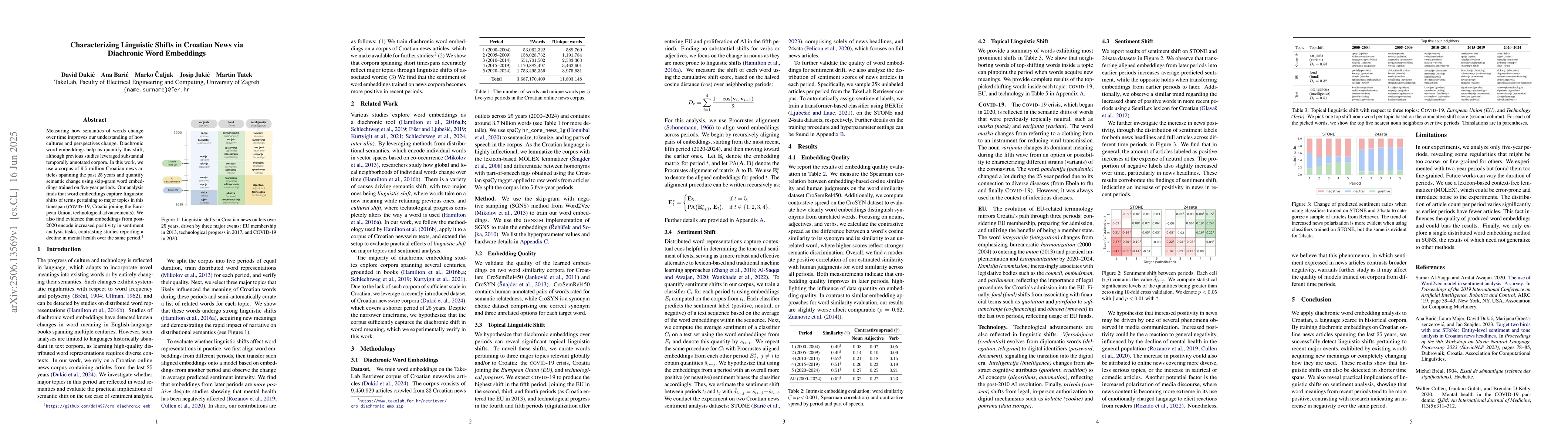 Measuring how semantics of words change over time improves our understanding of how cultures and perspectives change. Diachronic word embeddings help us quantify this shift, although previous studies leveraged substantial temporally annotated corpora. In this work, we use a corpus of 9.5 million Croatian news articles spanning the past 25 years and quantify semantic change using skip-gram word embeddings trained on five-year periods. Our analysis finds that word embeddings capture linguistic shifts of terms pertaining to major topics in this timespan (COVID-19, Croatia joining the European Union, technological advancements). We also find evidence that embeddings from post-2020 encode increased positivity in sentiment analysis tasks, contrasting studies reporting a decline in mental health over the same period.