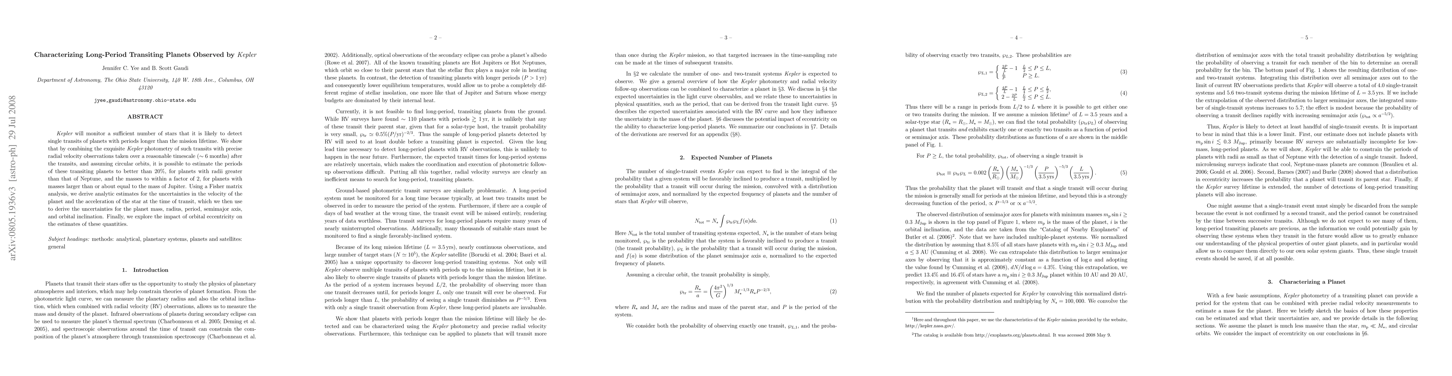 Kepler will monitor a sufficient number of stars that it is likely to detect single transits of planets with periods longer than the mission lifetime. We show that by combining the exquisite Kepler photometry of such transits with precise radial velocity observations taken over a reasonable timescale (~ 6 months) after the transits, and assuming circular orbits, it is possible to estimate the periods of these transiting planets to better than 20%, for planets with radii greater than that of Neptune, and the masses to within a factor of 2, for planets with masses larger than or about equal to the mass of Jupiter. Using a Fisher matrix analysis, we derive analytic estimates for the uncertainties in the velocity of the planet and the acceleration of the star at the time of transit, which we then use to derive the uncertainties for the planet mass, radius, period, semimajor axis, and orbital inclination. Finally, we explore the impact of orbital eccentricity on the estimates of these quantities.