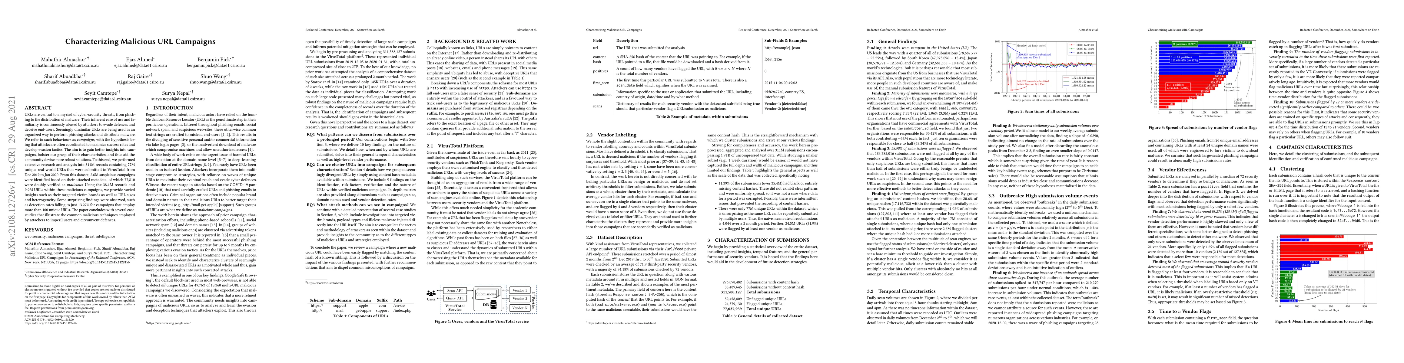 This paper characterizes malicious URL campaigns by analyzing 311M records from VirusTotal, identifying 2.6M suspicious campaigns with 77,810 doubly verified as malicious. Key findings include low detection rates for campaigns using over 100 unique URLs and insights into targeted victim brands and URL heterogeneity, concluding with case studies of common malicious techniques.