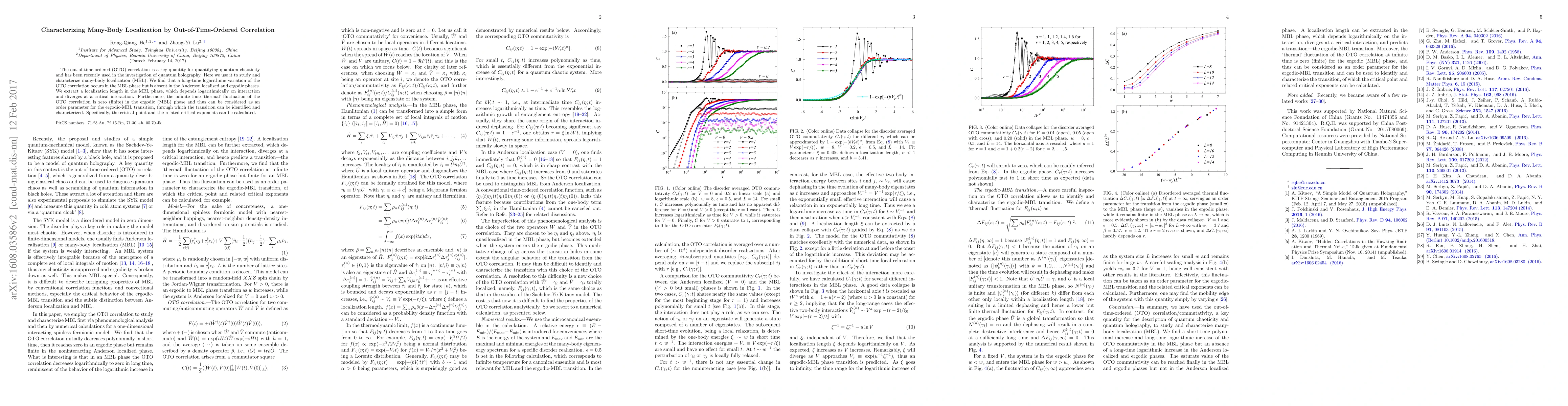 This paper characterizes many-body localization (MBL) using out-of-time-ordered (OTO) correlations, finding a long-time logarithmic variation in the MBL phase absent in ergodic phases. It identifies an MBL localization length and uses the infinite-time thermal fluctuation of OTO correlations as an order parameter for the ergodic-MBL transition.