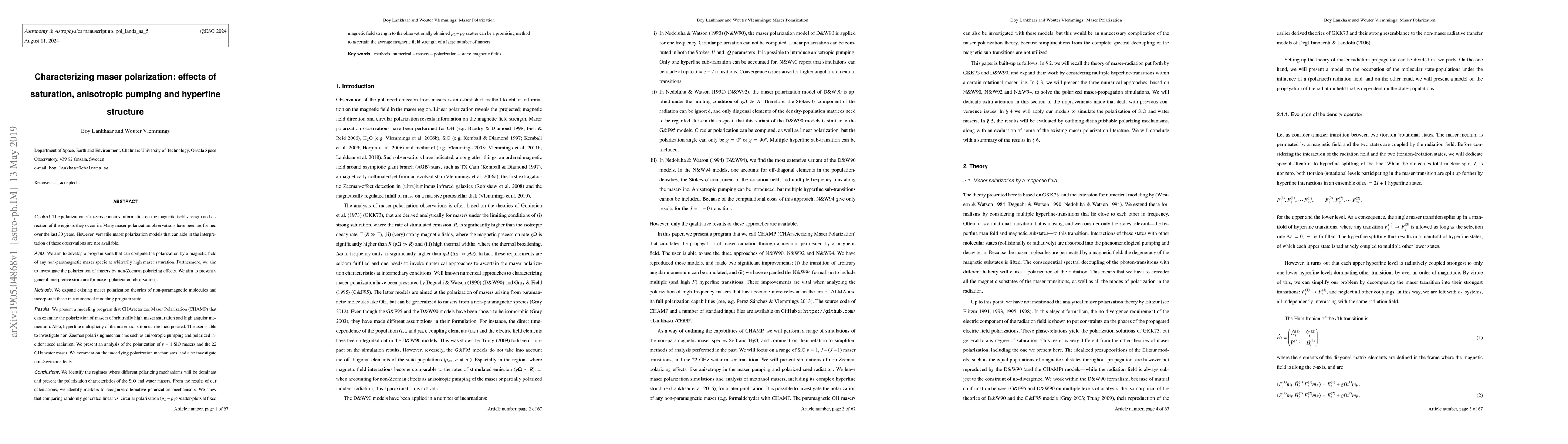The polarization of masers contains information on the magnetic field strength and direction of the regions they occur in. Many maser polarization observations have been performed over the last 30 years. However, versatile maser polarization models that can aide in the interpretation of these observations are not available. We aim to develop a program suite that can compute the polarization by a magnetic field of any non-paramagnetic maser specie at arbitrarily high maser saturation. Furthermore, we aim to investigate the polarization of masers by non-Zeeman polarizing effects. We aim to present a general interpretive structure for maser polarization observations. We expand existing maser polarization theories of non-paramagnetic molecules and incorporate these in a numerical modeling program suite. We present a modeling program that CHAracterizes Maser Polarization (CHAMP) that can examine the polarization of masers of arbitrarily high maser saturation and high angular momentum. Also, hyperfine multiplicity of the maser-transition can be incorporated. The user is able to investigate non-Zeeman polarizing mechanisms such as anisotropic pumping and polarized incident seed radiation. We present an analysis of the polarization of v = 1 SiO masers and the 22 GHz water maser. We comment on the underlying polarization mechanisms, and also investigate non-Zeeman effects. We identify the regimes where different polarizing mechanisms will be dominant and present the polarization characteristics of the SiO and water masers. From the results of our calculations, we identify markers to recognize alternative polarization mechanisms.