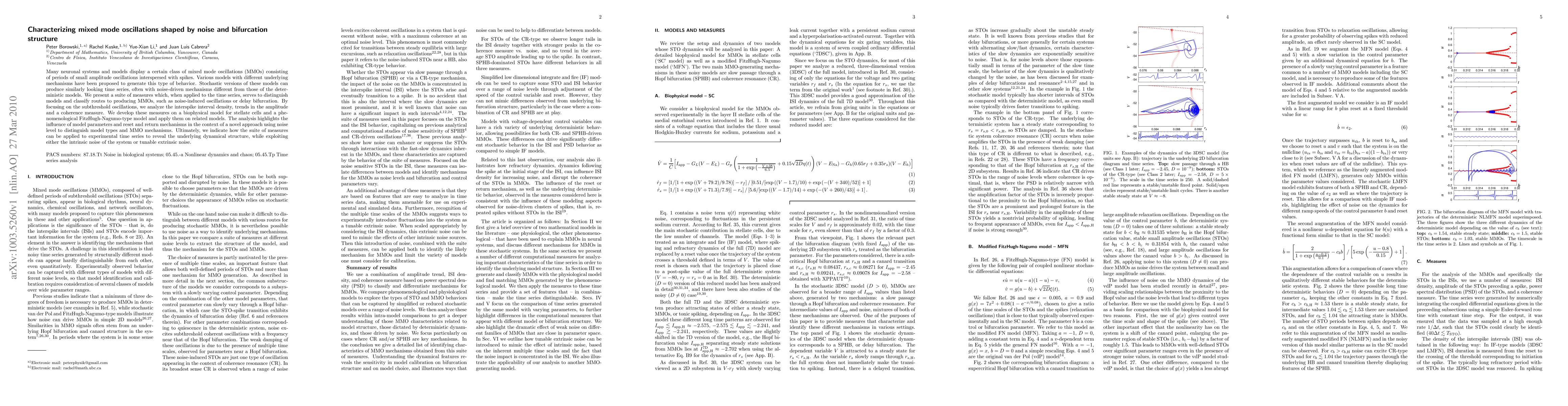 Many neuronal systems and models display a certain class of mixed mode oscillations (MMOs) consisting of periods of small amplitude oscillations interspersed with spikes. Various models with different underlying mechanisms have been proposed to generate this type of behavior. Stochastic versions of these models can produce similarly looking time series, often with noise-driven mechanisms different from those of the deterministic models. We present a suite of measures which, when applied to the time series, serves to distinguish models and classify routes to producing MMOs, such as noise-induced oscillations or delay bifurcation. By focusing on the subthreshold oscillations, we analyze the interspike interval density, trends in the amplitude and a coherence measure. We develop these measures on a biophysical model for stellate cells and a phenomenological FitzHugh-Nagumo-type model and apply them on related models. The analysis highlights the influence of model parameters and reset and return mechanisms in the context of a novel approach using noise level to distinguish model types and MMO mechanisms. Ultimately, we indicate how the suite of measures can be applied to experimental time series to reveal the underlying dynamical structure, while exploiting either the intrinsic noise of the system or tunable extrinsic noise.