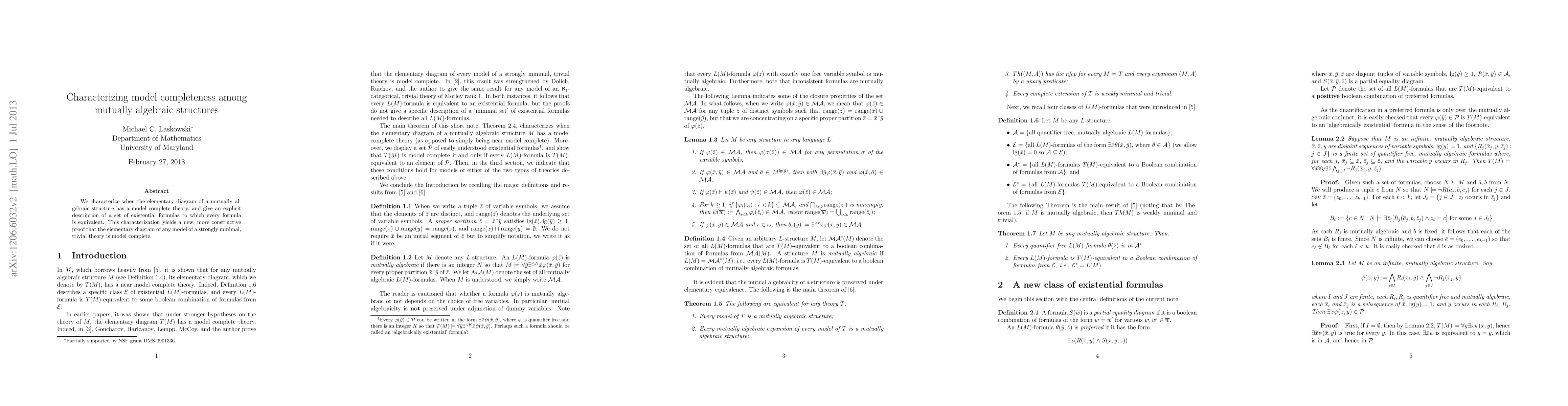 This paper characterizes conditions under which the elementary diagram of mutually algebraic structures has a model complete theory, providing a set of existential formulas equivalent to any formula, and offers a constructive proof for the model completeness of strongly minimal, trivial theories.