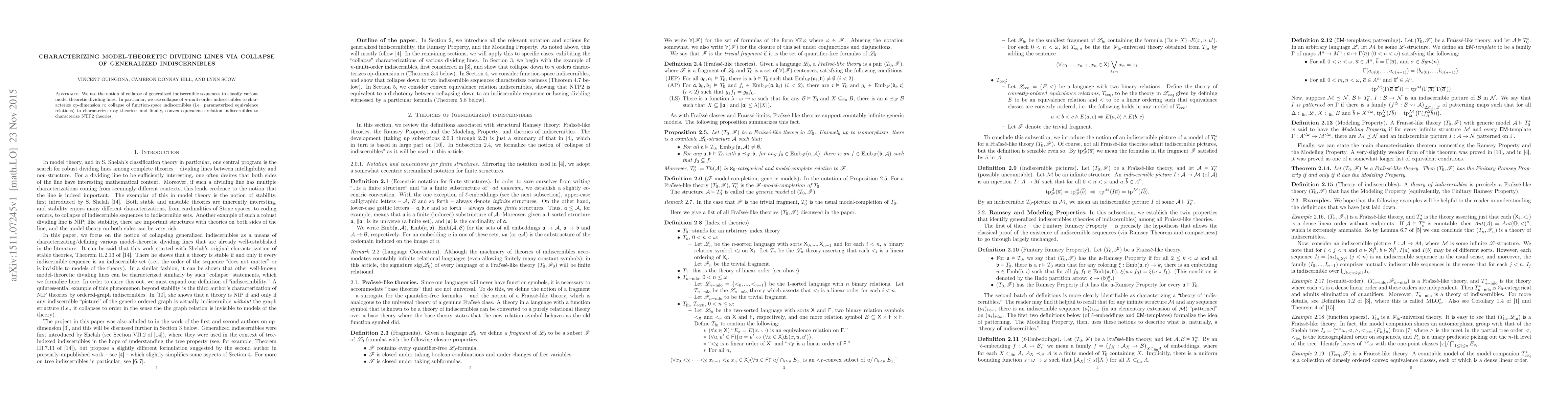 We use the notion of collapse of generalized indiscernible sequences to classify various model theoretic dividing lines. In particular, we use collapse of n-multi-order indiscernibles to characterize op-dimension n; collapse of function-space indiscernibles (i.e. parameterized equivalence relations) to characterize rosy theories; and finally, convex equivalence relation indiscernibles to characterize NTP2 theories.