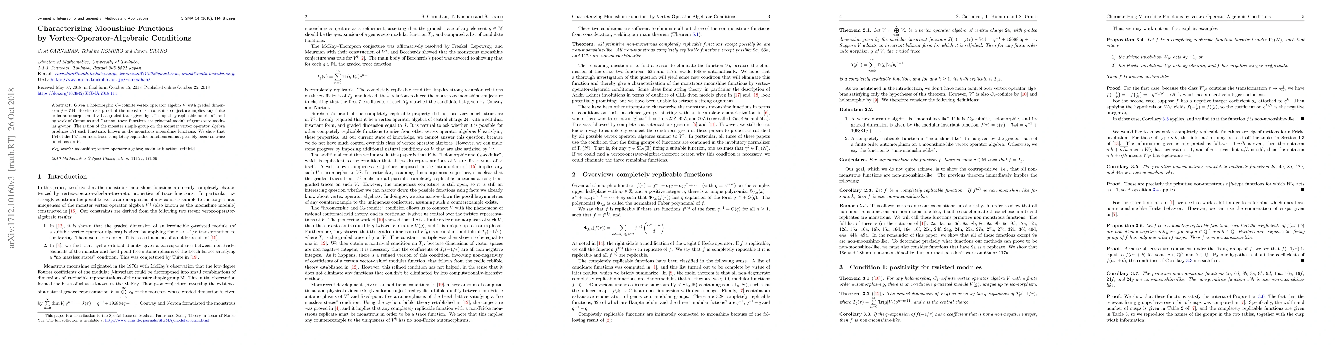 Given a holomorphic $C_2$-cofinite vertex operator algebra $V$ with graded dimension $j-744$, Borcherds's proof of the monstrous moonshine conjecture implies any finite order automorphism of $V$ has graded trace given by a "completely replicable function", and by work of Cummins and Gannon, these functions are principal moduli of genus zero modular groups. The action of the monster simple group on the monster vertex operator algebra produces 171 such functions, known as the monstrous moonshine functions. We show that 154 of the 157 non-monstrous completely replicable functions cannot possibly occur as trace functions on $V$.