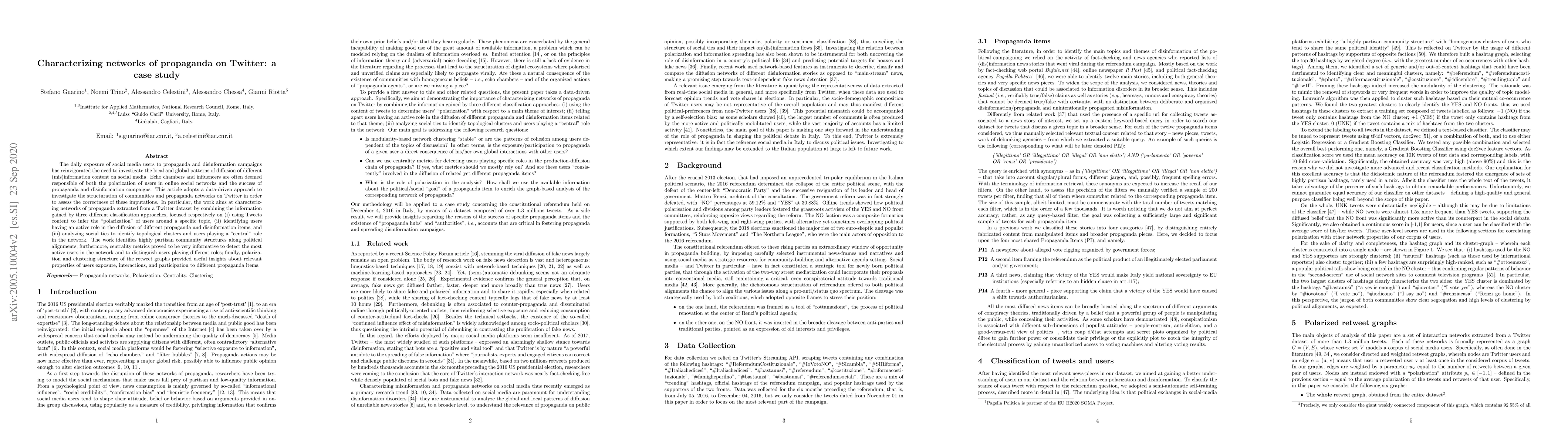 The daily exposure of social media users to propaganda and disinformation campaigns has reinvigorated the need to investigate the local and global patterns of diffusion of different (mis)information content on social media. Echo chambers and influencers are often deemed responsible of both the polarization of users in online social networks and the success of propaganda and disinformation campaigns. This article adopts a data-driven approach to investigate the structuration of communities and propaganda networks on Twitter in order to assess the correctness of these imputations. In particular, the work aims at characterizing networks of propaganda extracted from a Twitter dataset by combining the information gained by three different classification approaches, focused respectively on (i) using Tweets content to infer the "polarization" of users around a specific topic, (ii) identifying users having an active role in the diffusion of different propaganda and disinformation items, and (iii) analyzing social ties to identify topological clusters and users playing a "central" role in the network. The work identifies highly partisan community structures along political alignments; furthermore, centrality metrics proved to be very informative to detect the most active users in the network and to distinguish users playing different roles; finally, polarization and clustering structure of the retweet graphs provided useful insights about relevant properties of users exposure, interactions, and participation to different propaganda items.