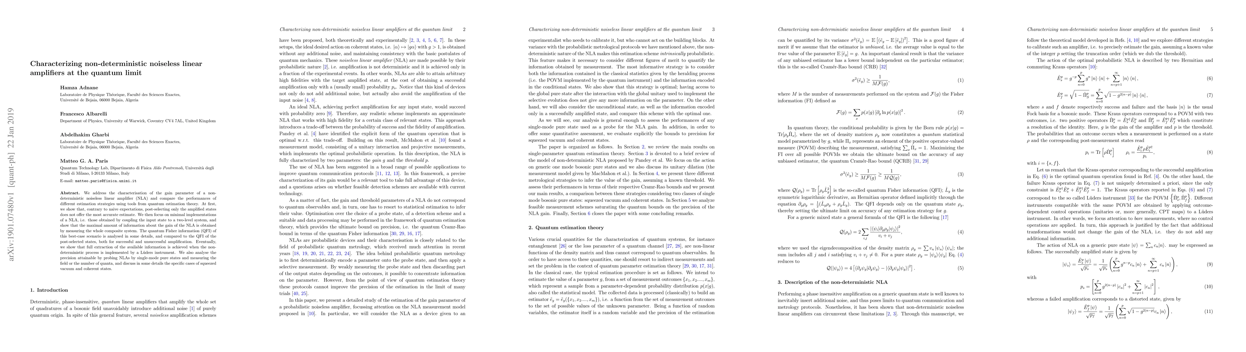This research explores the characterization of non-deterministic noiseless linear amplifiers (NLA) at the quantum limit, finding that measuring the whole composite system yields the most accurate estimate of the gain parameter. It compares various estimation strategies, revealing that full information extraction is achieved with a Lüders instrument implementation. The study also analyzes precision attainable with single-mode pure states, focusing on squeezed vacuum and coherent states.