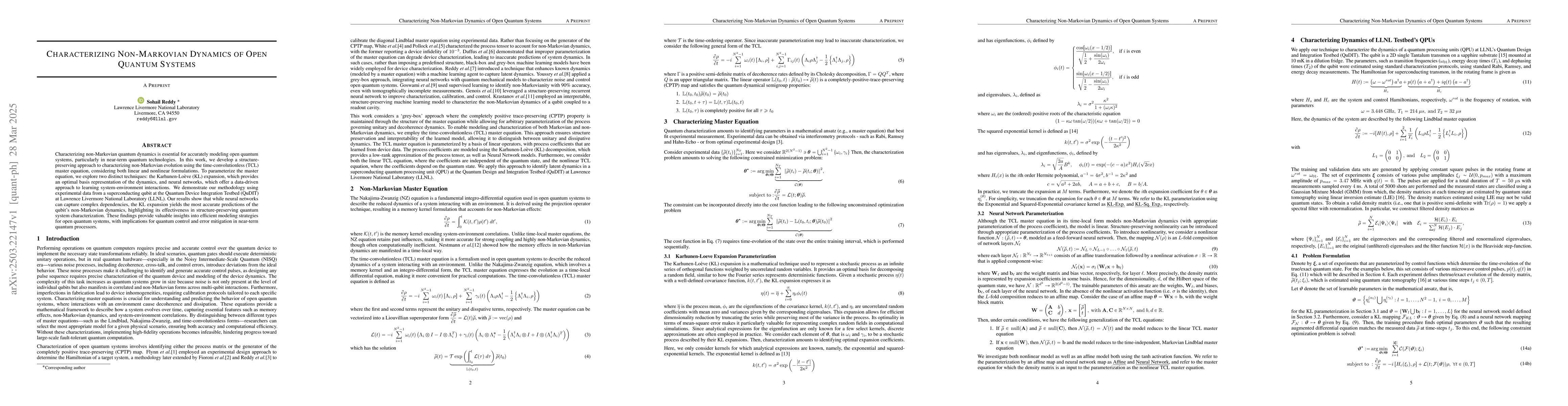 The research develops a structure-preserving approach using the time-convolutionless (TCL) master equation for characterizing non-Markovian quantum dynamics, considering both linear and nonlinear formulations. It parameterizes the TCL master equation using Karhunen-Loeve (KL) expansion and neural networks, demonstrated with experimental data from a superconducting qubit at QuDIT, LLNL.