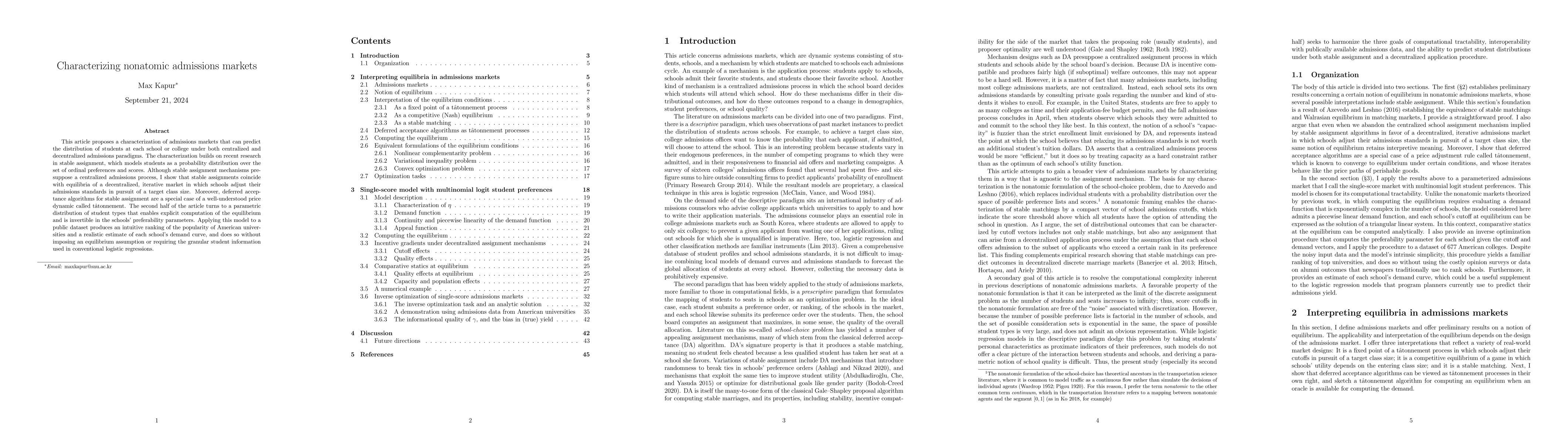 The research proposes a characterization of admissions markets using a stable assignment mechanism that models students as a probability distribution over ordinal preferences and scores. It demonstrates that stable assignments coincide with equilibria of a decentralized, iterative market where schools adjust admissions standards based on target class sizes.