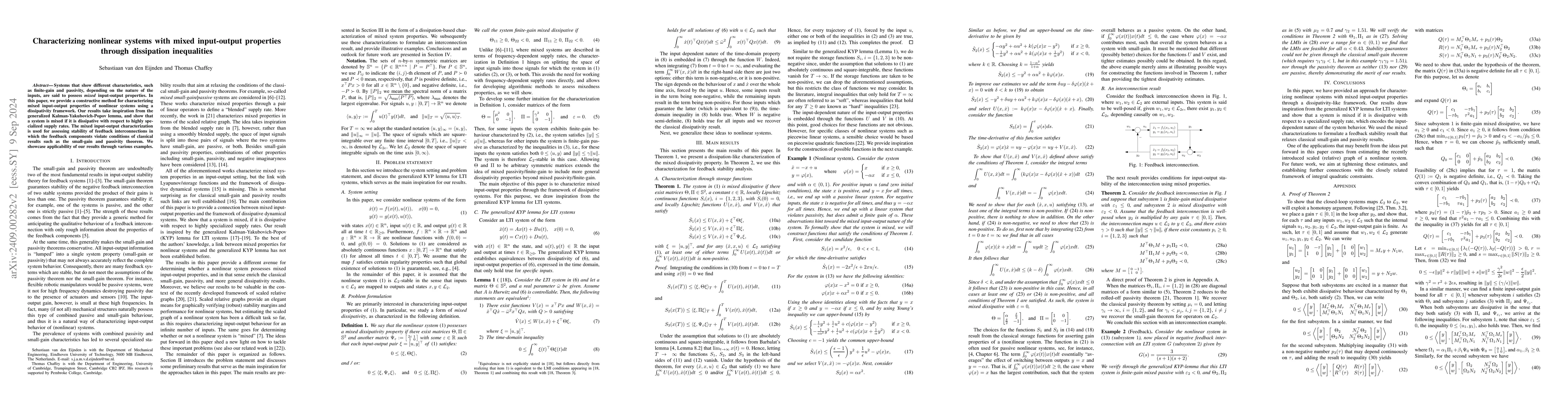Systems that show different characteristics, such as finite-gain and passivity, depending on the nature of the inputs, are said to possess mixed input-output properties. In this paper, we provide a constructive method for characterizing mixed input-output properties of nonlinear systems using a dissipativity framework. Our results take inspiration from the generalized Kalman-Yakubovich-Popov lemma, and show that a system is mixed if it is dissipative with respect to highly specialized supply rates. The mixed input-output characterization is used for assessing stability of feedback interconnections in which the feedback components violate conditions of classical results such as the small-gain and passivity theorem. We showcase applicability of our results through various examples.