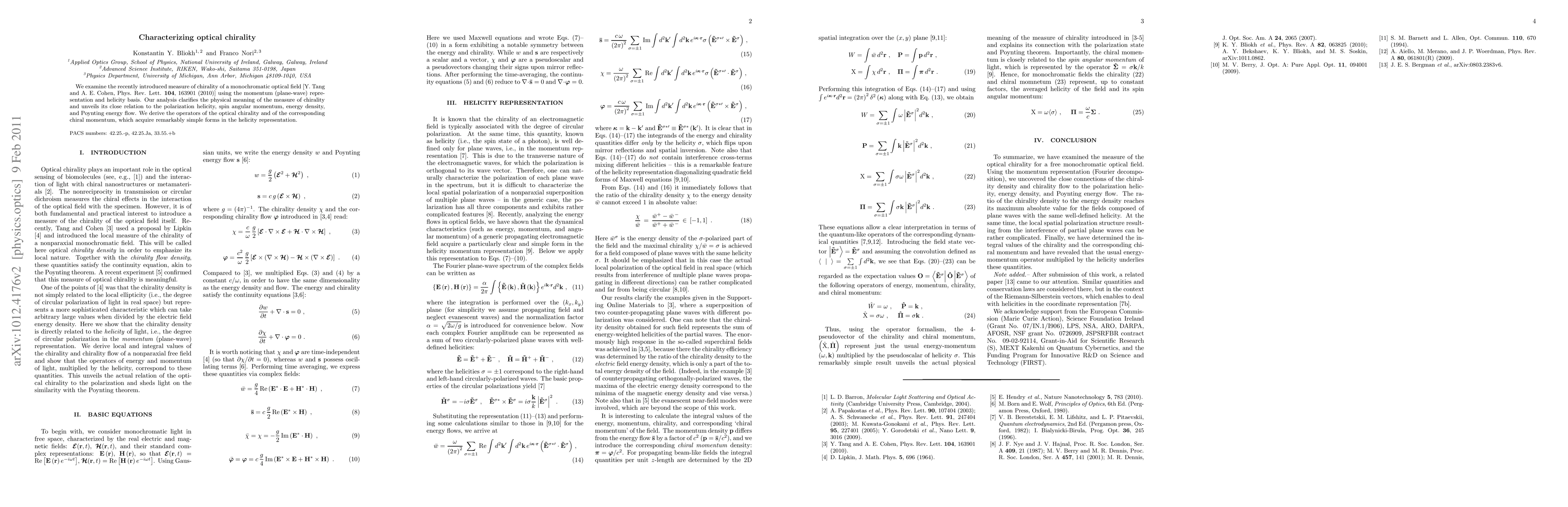 We examine the recently introduced measure of chirality of a monochromatic optical field [Y. Tang and A. E. Cohen, Phys. Rev. Lett. 104, 163901 (2010)] using the momentum (plane-wave) representation and helicity basis. Our analysis clarifies the physical meaning of the measure of chirality and unveils its close relation to the polarization helicity, spin angular momentum, energy density, and Poynting energy flow. We derive the operators of the optical chirality and of the corresponding chiral momentum, which acquire remarkably simple forms in the helicity representation.
