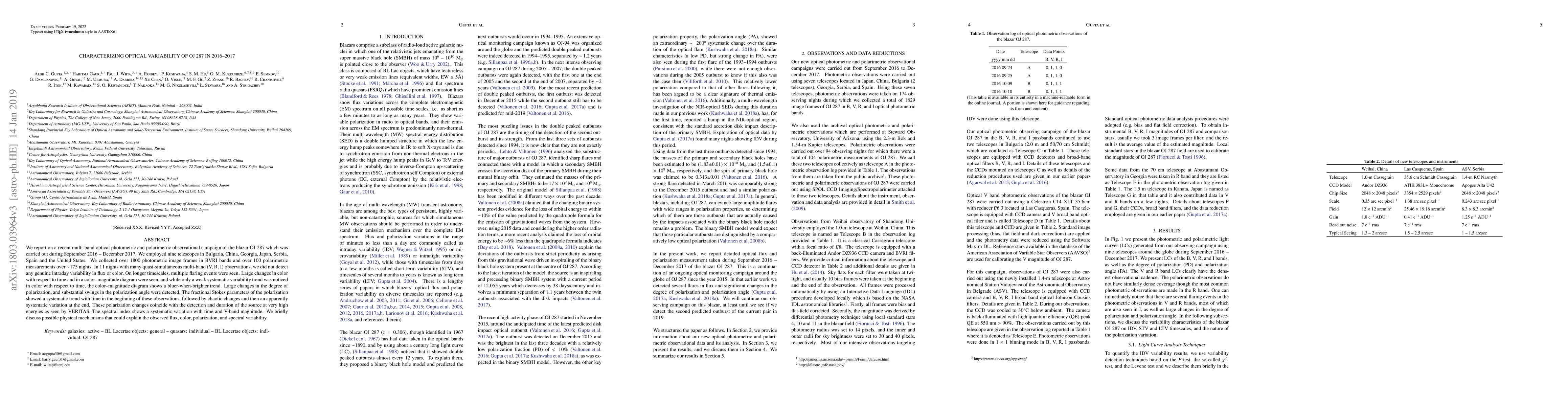 We report on a recent multi-band optical photometric and polarimetric observational campaign of the blazar OJ 287 which was carried out during September 2016 -- December 2017. We employed nine telescopes in Bulgaria, China, Georgia, Japan, Serbia, Spain and the United States. We collected over 1800 photometric image frames in BVRI bands and over 100 polarimetric measurements over ~175 nights. In 11 nights with many quasi-simultaneous multi-band (V, R, I) observations, we did not detect any genuine intraday variability in flux or color. On longer timescales, multiple flaring events were seen. Large changes in color with respect to time and in a color--magnitude diagram were seen, and while only a weak systematic variability trend was noticed in color with respect to time, the color--magnitude diagram shows a bluer-when-brighter trend. Large changes in the degree of polarization, and substantial swings in the polarization angle were detected. The fractional Stokes parameters of the polarization showed a systematic trend with time in the beginning of these observations, followed by chaotic changes and then an apparently systematic variation at the end. These polarization changes coincide with the detection and duration of the source at very high energies as seen by VERITAS. The spectral index shows a systematic variation with time and V-band magnitude. We briefly discuss possible physical mechanisms that could explain the observed flux, color, polarization, and spectral variability.