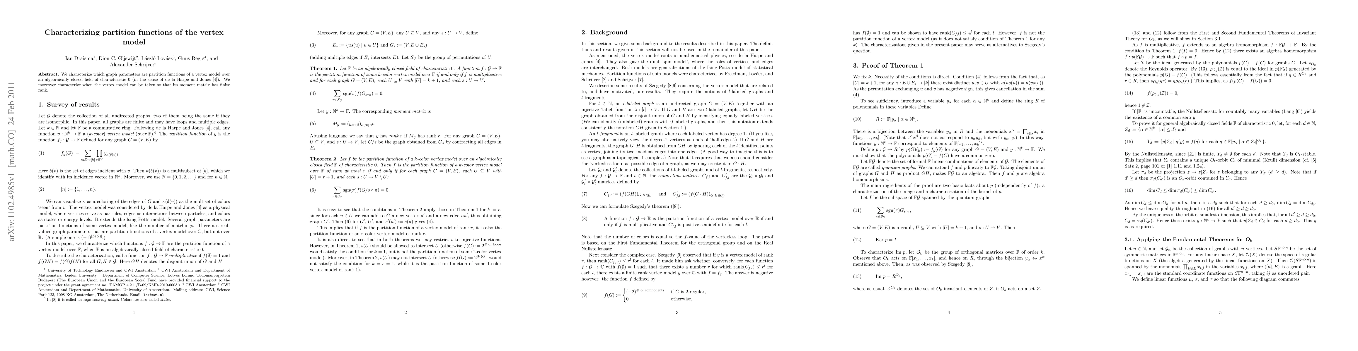 We characterize which graph parameters are partition functions of a vertex model over an algebraically closed field of characteristic 0 (in the sense of de la Harpe and Jones). We moreover characterize when the vertex model can be taken so that its moment matrix has finite rank.