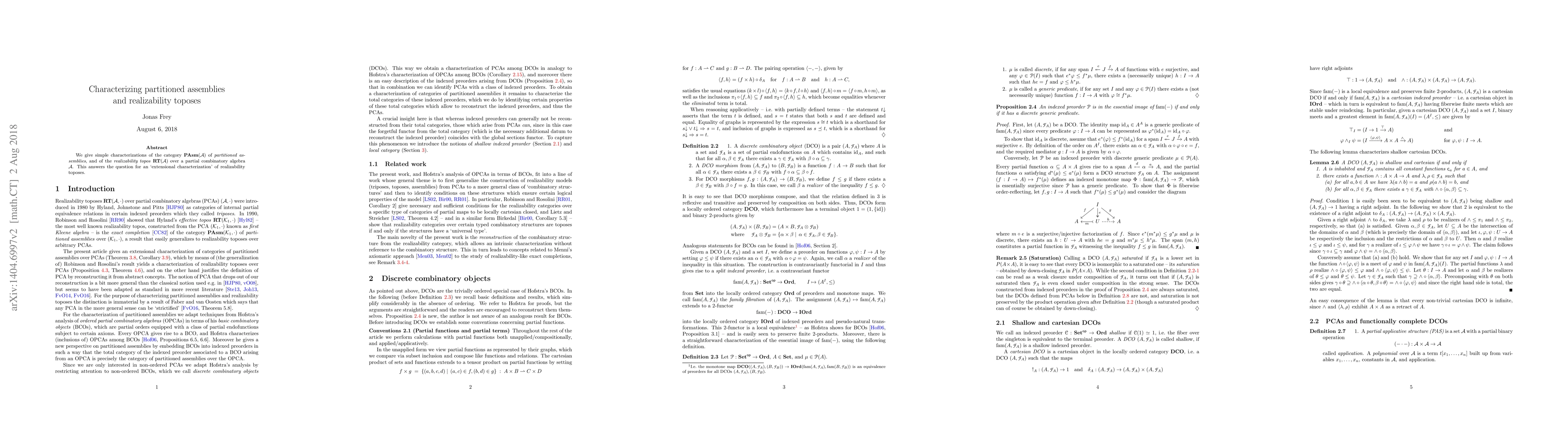 This paper characterizes the category of partitioned assemblies, PAsm(A), and the realizability topos, RT(A), over a partial combinatory algebra A, providing a simple extensional description of realizability toposes.