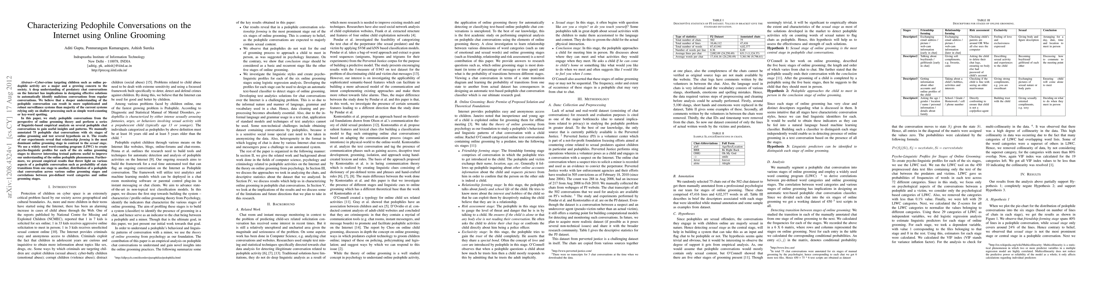 Cyber-crime targeting children such as online pedophile activity are a major and a growing concern to society. A deep understanding of predatory chat conversations on the Internet has implications in designing effective solutions to automatically identify malicious conversations from regular conversations. We believe that a deeper understanding of the pedophile conversation can result in more sophisticated and robust surveillance systems than majority of the current systems relying only on shallow processing such as simple word-counting or key-word spotting. In this paper, we study pedophile conversations from the perspective of online grooming theory and perform a series of linguistic-based empirical analysis on several pedophile chat conversations to gain useful insights and patterns. We manually annotated 75 pedophile chat conversations with six stages of online grooming and test several hypothesis on it. The results of our experiments reveal that relationship forming is the most dominant online grooming stage in contrast to the sexual stage. We use a widely used word-counting program (LIWC) to create psycho-linguistic profiles for each of the six online grooming stages to discover interesting textual patterns useful to improve our understanding of the online pedophile phenomenon. Furthermore, we present empirical results that throw light on various aspects of a pedophile conversation such as probability of state transitions from one stage to another, distribution of a pedophile chat conversation across various online grooming stages and correlations between pre-defined word categories and online grooming stages.