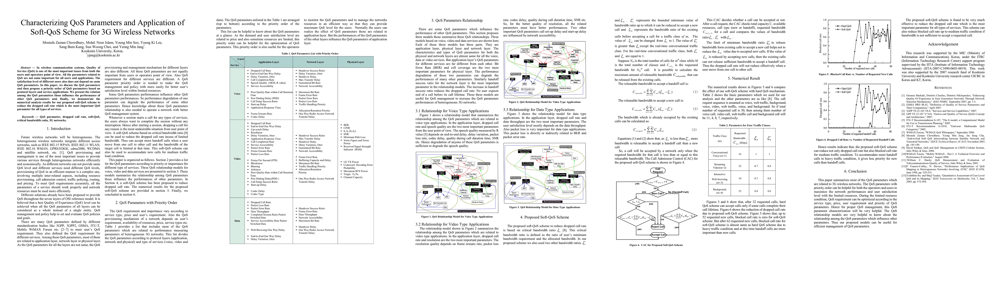 In wireless communication systems, Quality of Service (QoS) is one of the most important issues from both the users and operators point of view. All the parameters related to QoS are not same important for all users and applications. The satisfaction level of different users also does not depend on same QoS parameters. In this paper, we discuss the QoS parameters and then propose a priority order of QoS parameters based on protocol layers and service applications. We present the relation among the QoS parameters those influence the performance of other QoS parameters and, finally, we demonstrate the numerical analysis results for our proposed soft-QoS scheme to reduce the dropped call rate which is the most important QoS parameter for all types of services