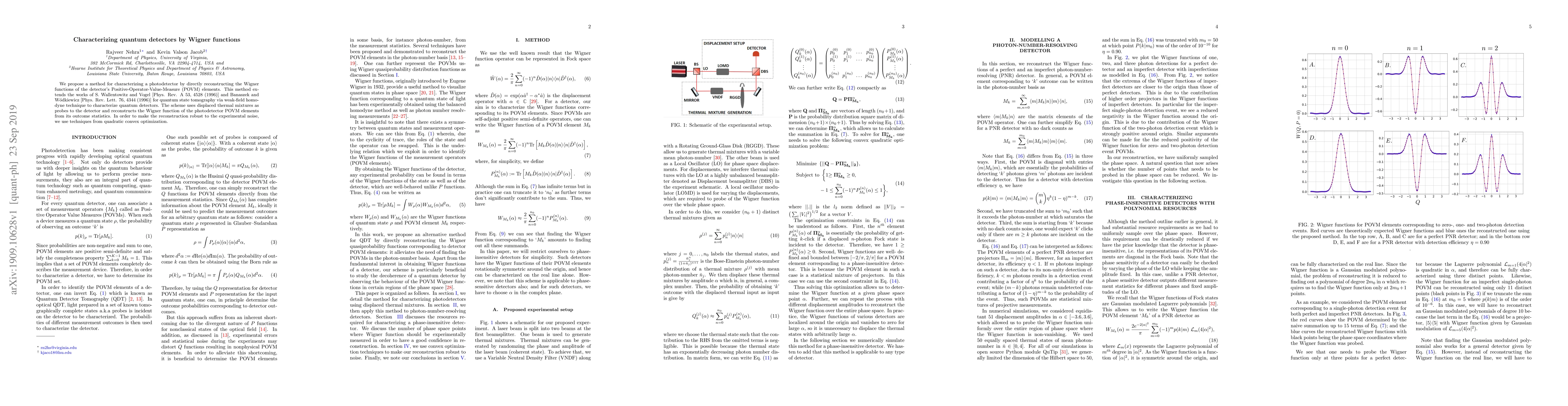 We propose a method for characterizing a photodetector by directly reconstructing the Wigner functions of the detector's Positive-Operator-Value-Measure (POVM) elements. This method extends the works of S. Wallentowitz and Vogel [Phys. Rev. A 53, 4528 (1996)] and Banaszek and W\'odkiewicz [Phys. Rev. Lett. 76, 4344 (1996)] for quantum state tomography via weak-field homodyne technique to characterize quantum detectors. The scheme uses displaced thermal mixtures as probes to the detector and reconstructs the Wigner function of the photodetector POVM elements from its outcome statistics. In order to make the reconstruction robust to the experimental noise, we use techniques from quadratic convex optimization.