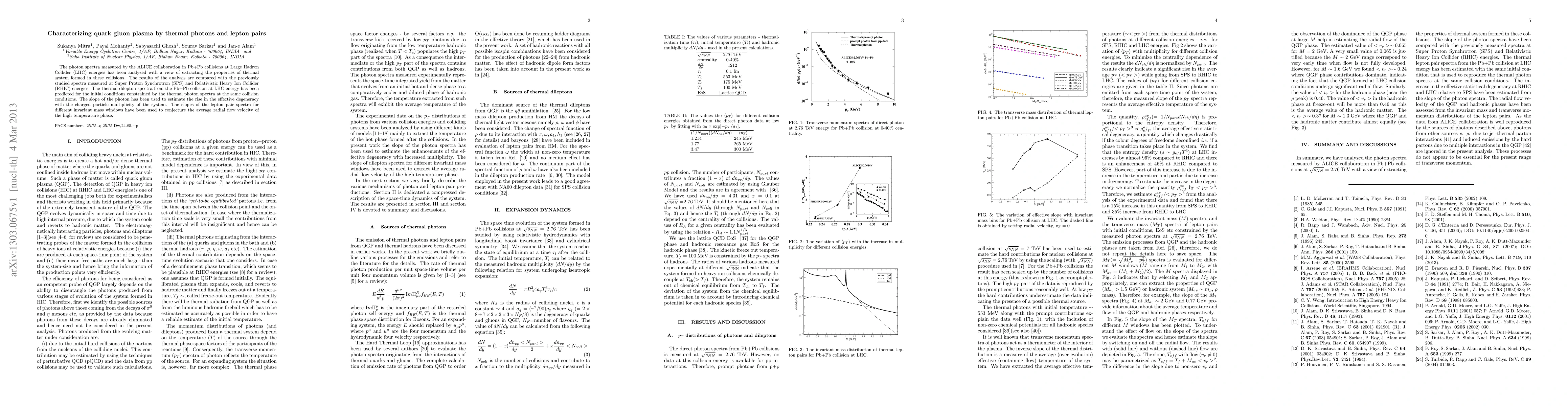 The study analyzes photon spectra from Pb+Pb LHC collisions to characterize quark-gluon plasma, comparing findings with SPS and RHIC data. It predicts thermal dilepton spectra, estimates effective degeneracy rise with multiplicity, and infers average radial flow velocity of the high-temperature phase using lepton pair spectra slopes.