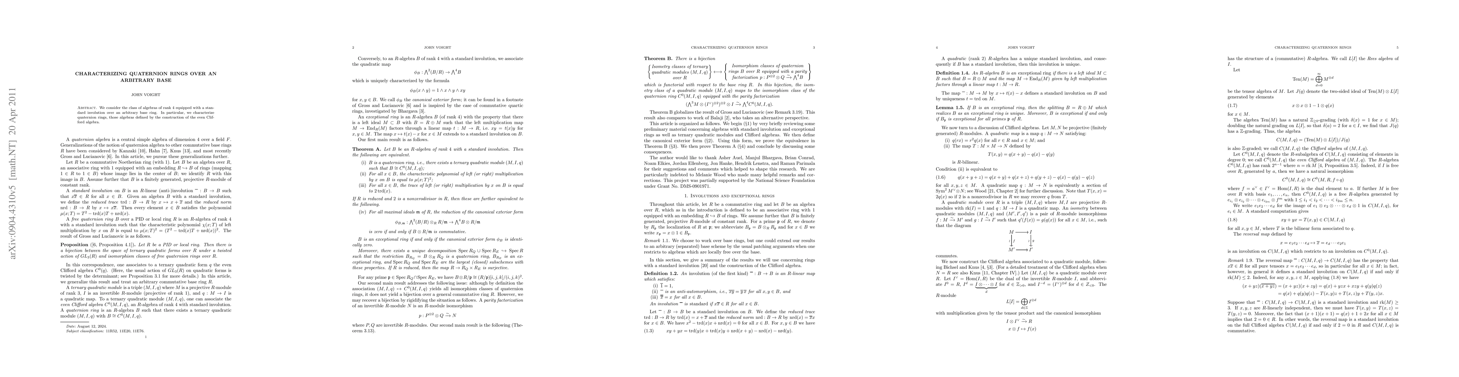Summary: This paper explores rank 4 algebras with standard involutions over arbitrary base rings, focusing on characterizing quaternion rings constructed via the even Clifford algebra. The study provides a detailed examination of their algebraic properties and structure.