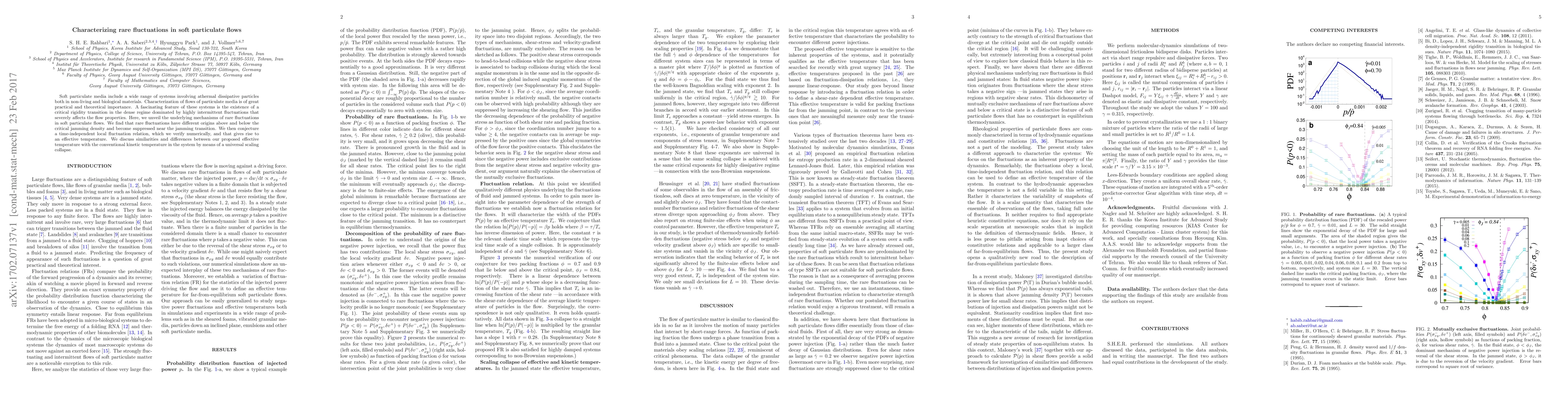 Soft particulate media include a wide range of systems involving athermal dissipative particles both in non-living and biological materials. Characterization of flows of particulate media is of great practical and theoretical importance. A fascinating feature of these systems is the existence of a critical rigidity transition in the dense regime dominated by highly intermittent fluctuations that severely affects the flow properties. Here, we unveil the underlying mechanisms of rare fluctuations in soft particulate flows. We find that rare fluctuations have different origins above and below the critical jamming density and become suppressed near the jamming transition. We then conjecture a time-independent local fluctuation relation, which we verify numerically, and that gives rise to an effective temperature. We discuss similarities and differences between our proposed effective temperature with the conventional kinetic temperature in the system by means of a universal scaling collapse.