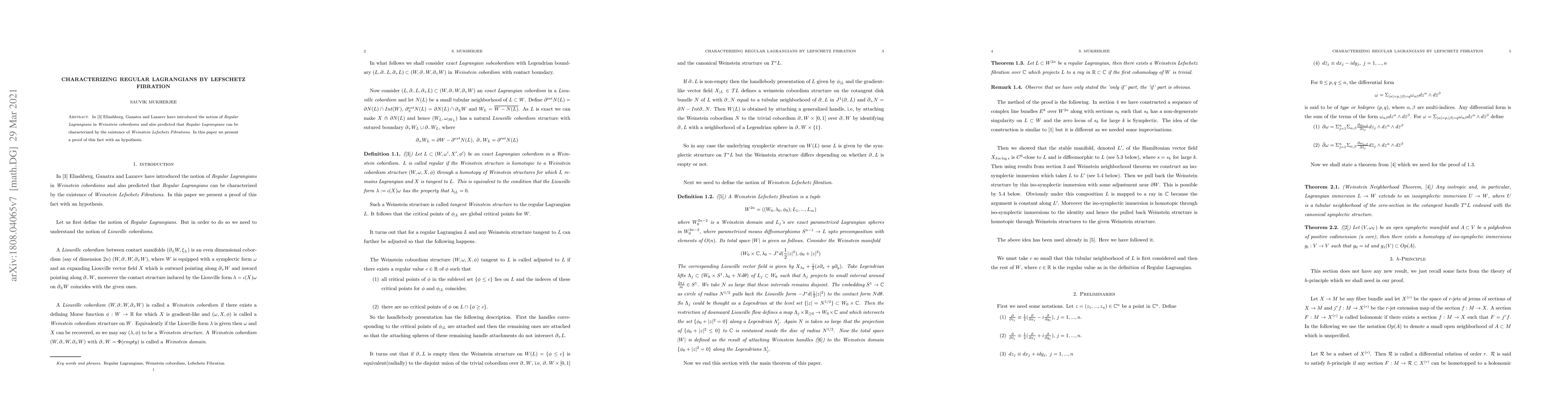 Researchers prove that regular Lagrangians can be characterized using Weinstein Lefschetz fibrations, providing a key insight into the topology of symplectic manifolds.