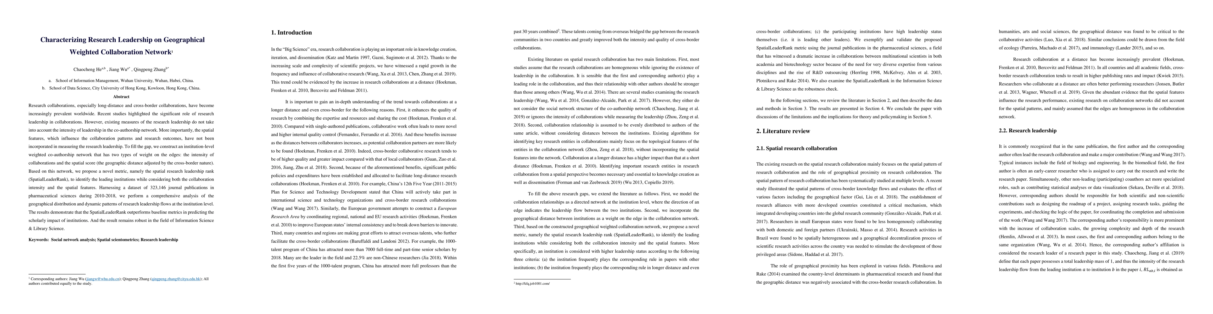 This paper introduces a novel metric, SpatialLeaderRank, to assess research leadership in geographical weighted collaboration networks, considering both collaboration intensity and spatial features. The study demonstrates that SpatialLeaderRank better predicts scholarly impact compared to baseline metrics, using a dataset from pharmaceutical sciences publications.