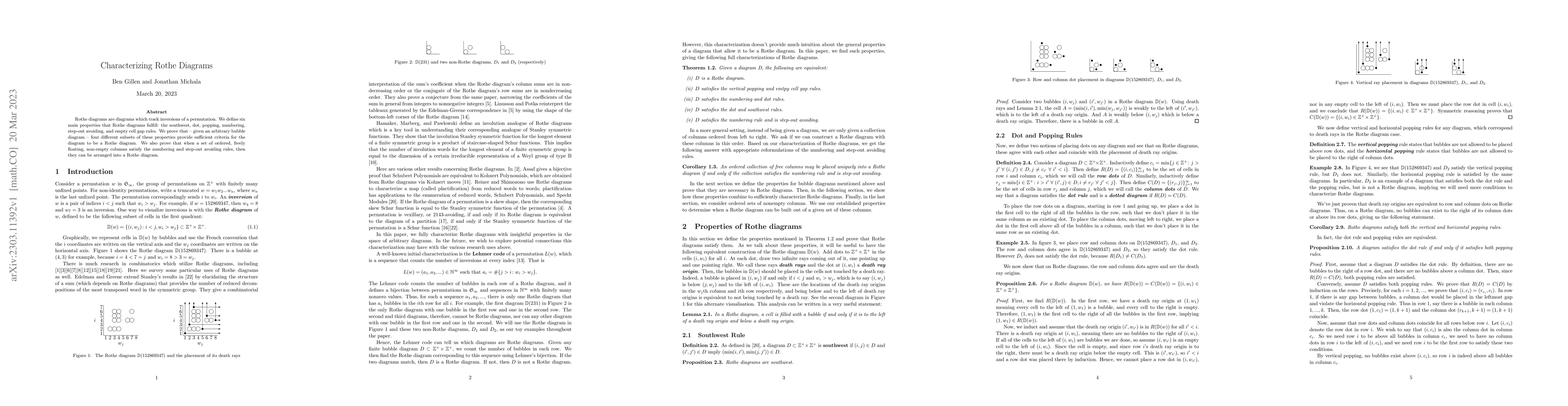 Rothe diagrams are diagrams which track inversions of a permutation. We define six main properties that Rothe diagrams fulfill: the southwest, dot, popping, numbering, step-out avoiding, and empty cell gap rules. We prove that -- given an arbitrary bubble diagram -- four different subsets of these properties provide sufficient criteria for the diagram to be a Rothe diagram. We also prove that when a set of ordered, freely floating, non-empty columns satisfy the numbering and step-out avoiding rules, then they can be arranged into a Rothe diagram.