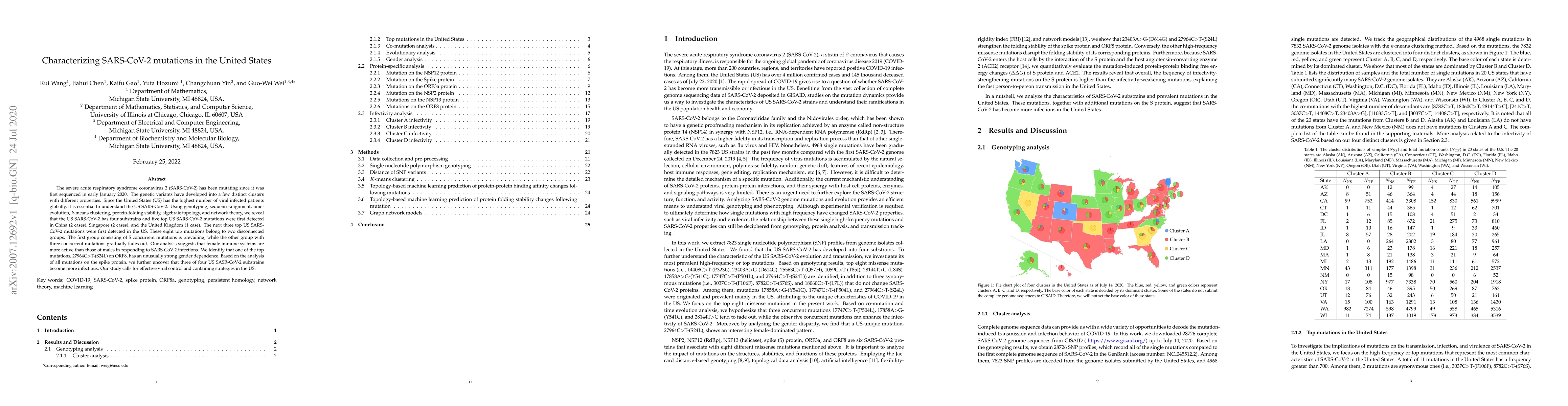 This study characterizes SARS-CoV-2 mutations in the United States, identifying four substrains and revealing that the top five mutations initially appeared in China, Singapore, and the UK. The analysis suggests that female immune systems respond more actively to the virus, with one mutation showing a strong gender dependence. Three of the four identified substrains exhibit increased infectiousness, highlighting the need for effective viral control strategies in the US.