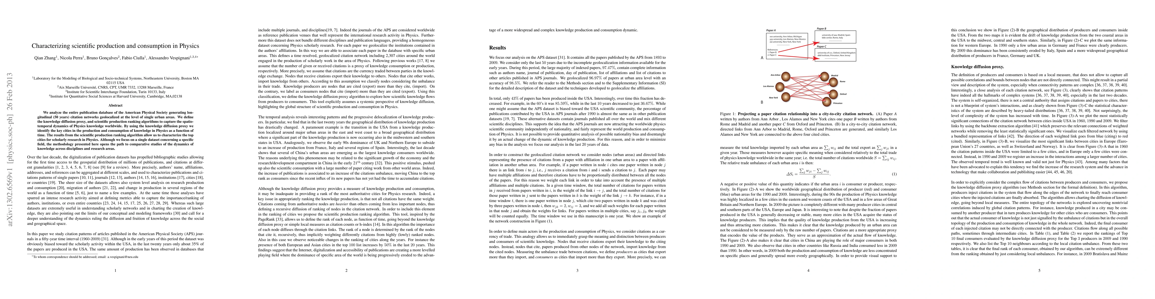 We analyze the entire publication database of the American Physical Society generating longitudinal (50 years) citation networks geolocalized at the level of single urban areas. We define the knowledge diffusion proxy, and scientific production ranking algorithms to capture the spatio-temporal dynamics of Physics knowledge worldwide. By using the knowledge diffusion proxy we identify the key cities in the production and consumption of knowledge in Physics as a function of time. The results from the scientific production ranking algorithm allow us to characterize the top cities for scholarly research in Physics. Although we focus on a single dataset concerning a specific field, the methodology presented here opens the path to comparative studies of the dynamics of knowledge across disciplines and research areas