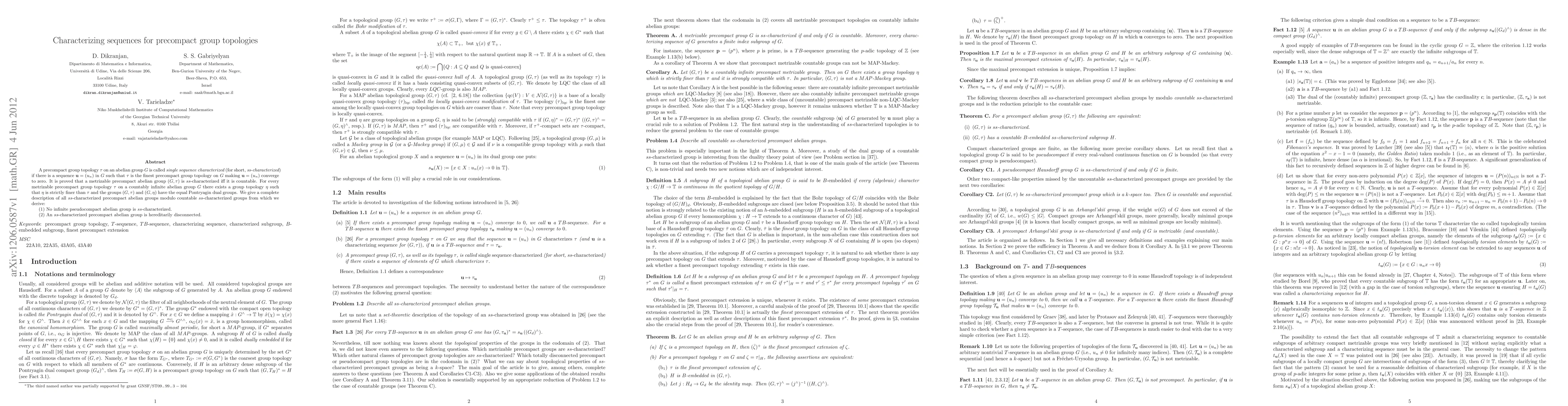 A precompact group topology $\tau$ on an abelian group $G$ is called {\em single sequence characterized} (for short, {\em ss-characterized}) if there is a sequence $\mathbf{u}= (u_n)$ in $G$ such that $\tau$ is the finest precompact group topology on $G$ making $\mathbf{u}=(u_n)$ converge to zero. It is proved that a metrizable precompact abelian group $(G,\tau)$ is $ss$-characterized iff it is countable. For every metrizable precompact group topology $\tau$ on a countably infinite abelian group $G$ there exists a group topology $\eta$ such that $\eta$ is strictly finer than $\tau$ and the groups $(G,\tau)$ and $(G,\eta)$ have the equal Pontryagin dual groups. We give a complete description of all $ss$-characterized precompact abelian groups modulo countable $ss$-characterized groups from which we derive: (1) No infinite pseudocompact abelian group is $ss$-characterized. (2) An $ss$-characterized precompact abelian group is hereditarily disconnected.