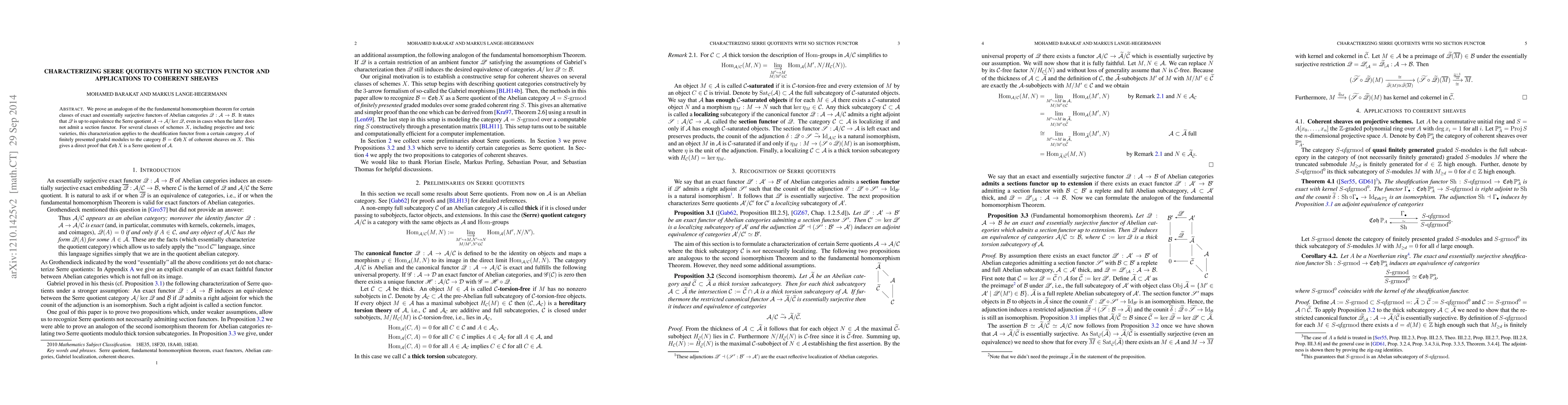 We prove an analogon of the the fundamental homomorphism theorem for certain classes of exact and essentially surjective functors of Abelian categories $\mathscr{Q}:\mathcal{A} \to \mathcal{B}$. It states that $\mathscr{Q}$ is up to equivalence the Serre quotient $\mathcal{A} \to \mathcal{A} / \mathrm{ker} \mathscr{Q}$, even in cases when the latter does not admit a section functor. For several classes of schemes $X$, including projective and toric varieties, this characterization applies to the sheafification functor from a certain category $\mathcal{A}$ of finitely presented graded modules to the category $\mathcal{B}=\mathfrak{Coh} X$ of coherent sheaves on $X$. This gives a direct proof that $\mathfrak{Coh} X$ is a Serre quotient of $\mathcal{A}$.