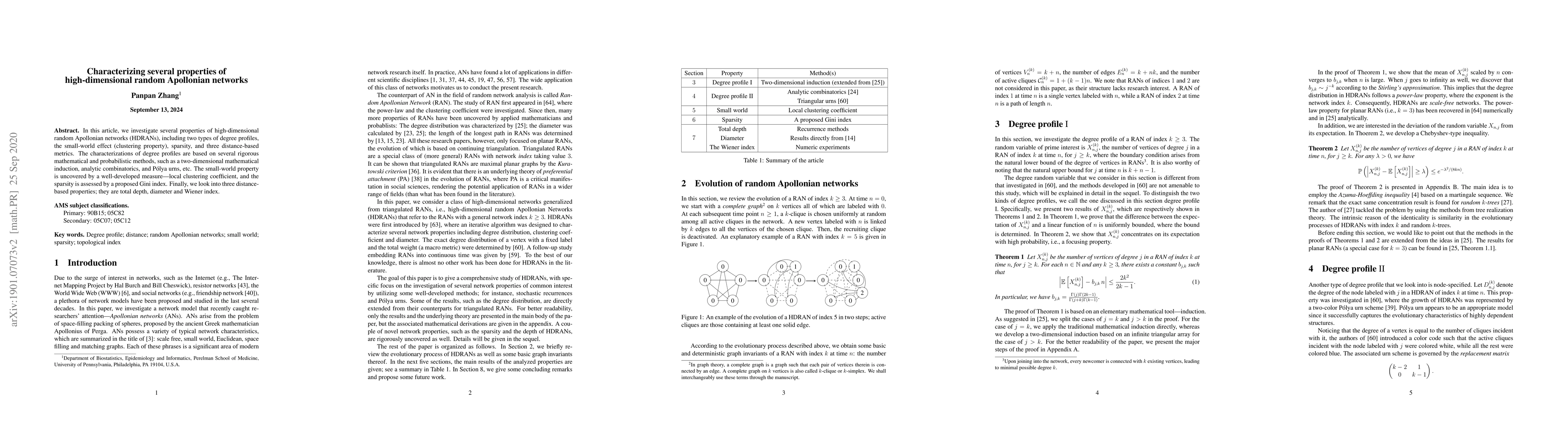 In this article, we investigate several properties of high-dimensional random Apollonian networks (HDRANs), including two types of degree profiles, the small-world effect (clustering property), sparsity, and three distance-based metrics. The characterizations of degree profiles are based on several rigorous mathematical and probabilistic methods, such as a two-dimensional mathematical induction, analytic combinatorics, and P\'{o}lya urns, etc. The small-world property is uncovered by a well-developed measure---local clustering coefficient, and the sparsity is assessed by a proposed Gini index. Finally, we look into three distance-based properties; they are total depth, diameter and Wiener index.