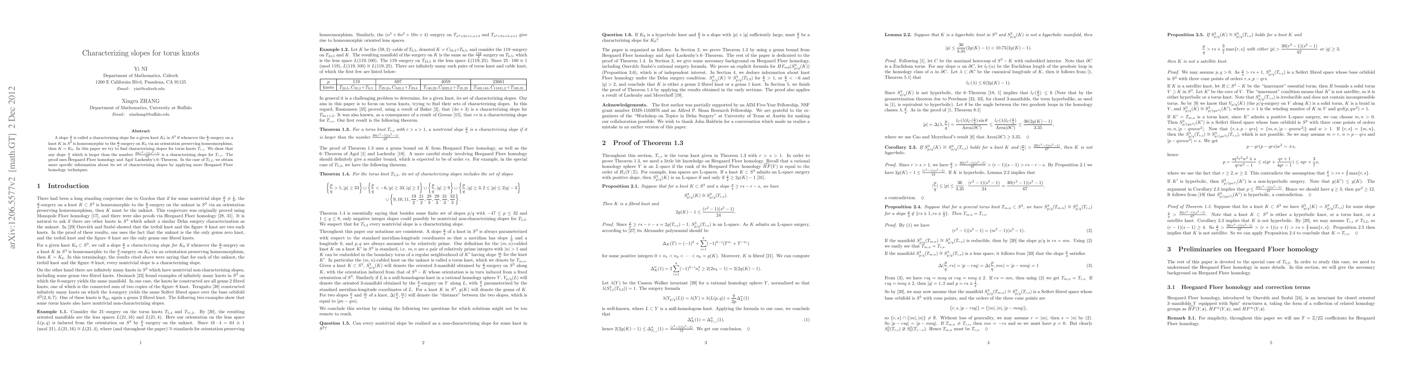 This paper identifies characterizing slopes for torus knots $T_{r,s}$ using Heegaard Floer homology and Agol-Lackenby's 6-Theorem, showing that slopes greater than $\frac{30(r^2-1)(s^2-1)}{67}$ are characterizing. For $T_{5,2}$, more specific results are derived through advanced Heegaard Floer homology techniques.