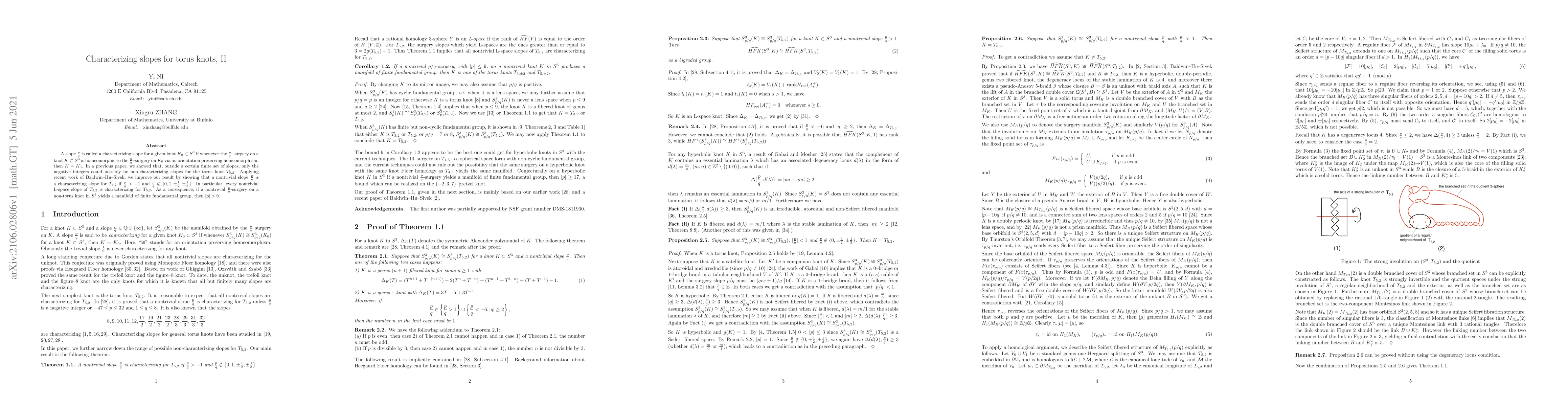 This paper characterizes slopes for torus knots, specifically showing that for the torus knot $T_{5,2}$, any nontrivial slope greater than $-1$ and not in a specified finite set is a characterizing slope. It further concludes that any nontrivial surgery on a non-torus knot yielding a manifold with finite fundamental group must have a slope with absolute value greater than 9.