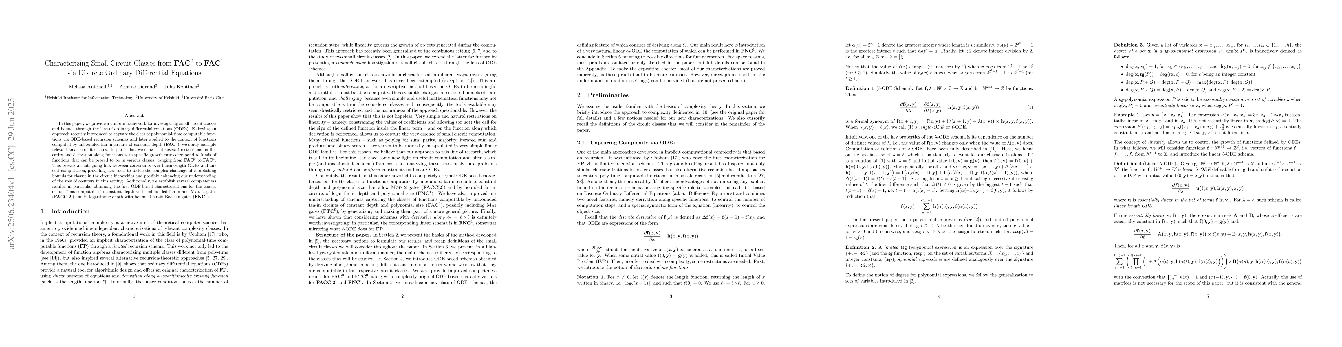 In this paper, we provide a uniform framework for investigating small circuit classes and bounds through the lens of ordinary differential equations (ODEs). Following an approach recently introduced to capture the class of polynomial-time computable functions via ODE-based recursion schemas and later applied to the context of functions computed by unbounded fan-in circuits of constant depth (FAC^0), we study multiple relevant small circuit classes. In particular, we show that natural restrictions on linearity and derivation along functions with specific growth rate correspond to kinds of functions that can be proved to be in various classes, ranging from FAC^0 to FAC^1. This reveals an intriguing link between constraints over linear-length ODEs and circuit computation, providing new tools to tackle the complex challenge of establishing bounds for classes in the circuit hierarchies and possibly enhancing our understanding of the role of counters in this setting. Additionally, we establish several completeness results, in particular obtaining the first ODE-based characterizations for the classes of functions computable in constant depth with unbounded fan-in and Mod 2 gates (FACC[2]) and in logarithmic depth with bounded fan-in Boolean gates (FNC1).